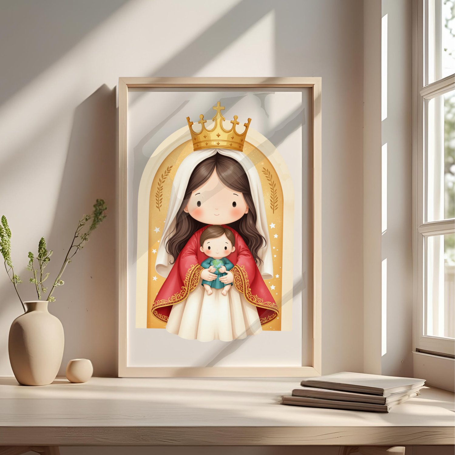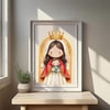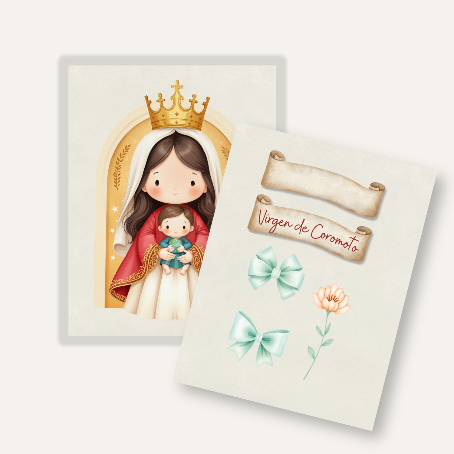1x Ilustración principal de la Virgen de Coromoto: Una imagen de la Virgen María con el Niño Jesús, en su advocación de Coromoto, en un estilo dulce y moderno. Ideal para estampitas, oraciones, recordatorios y más.