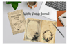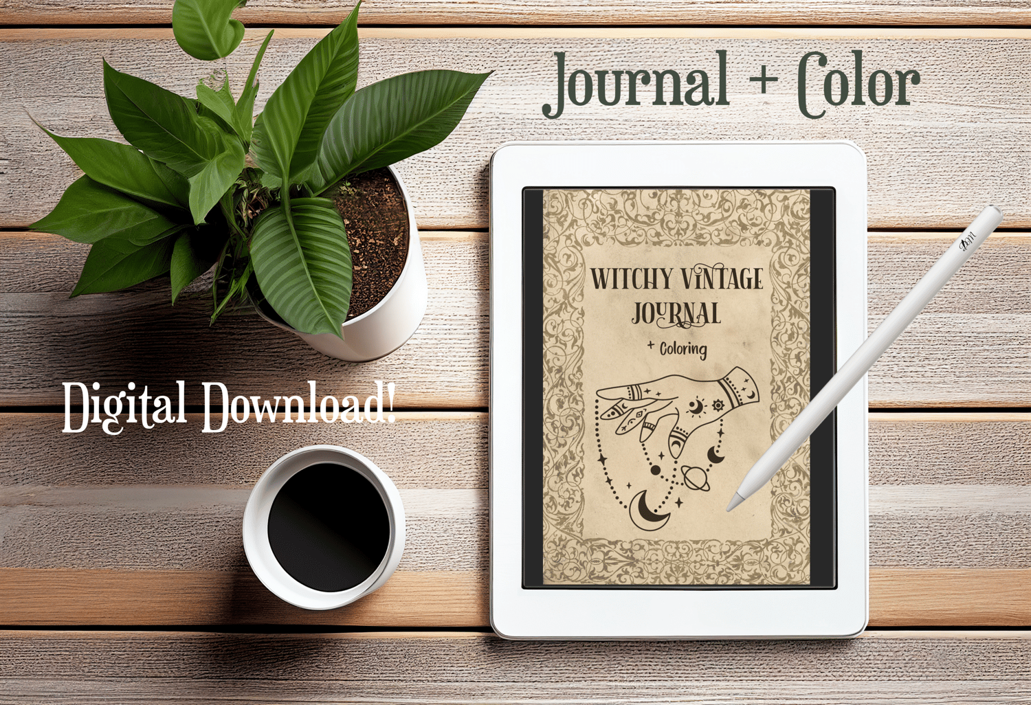 Journal and color in this witchy-themed vintage style journal. Witchy-themed coloring pages are spread throughout. Relax and decompress while you write, journal, doodle, and color.