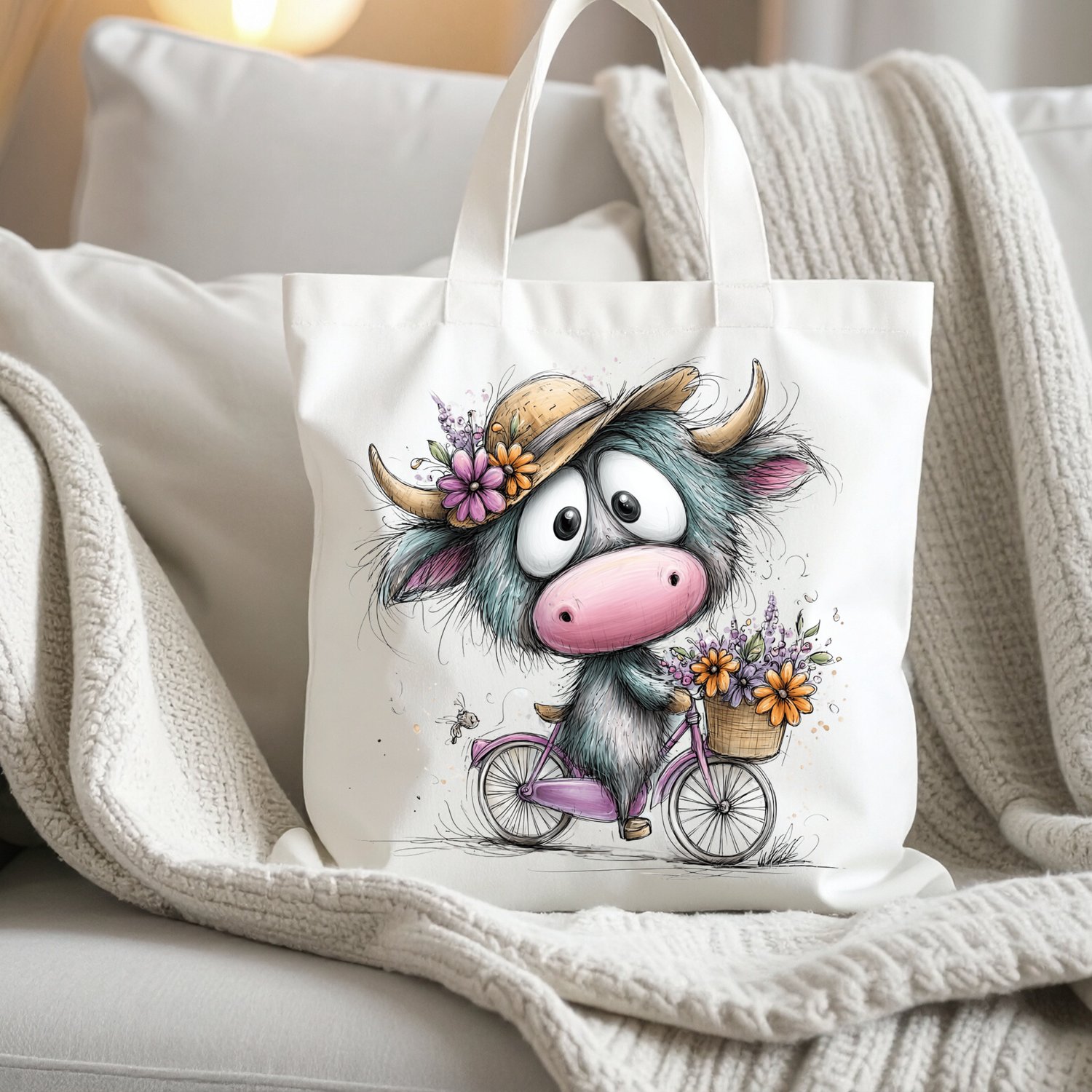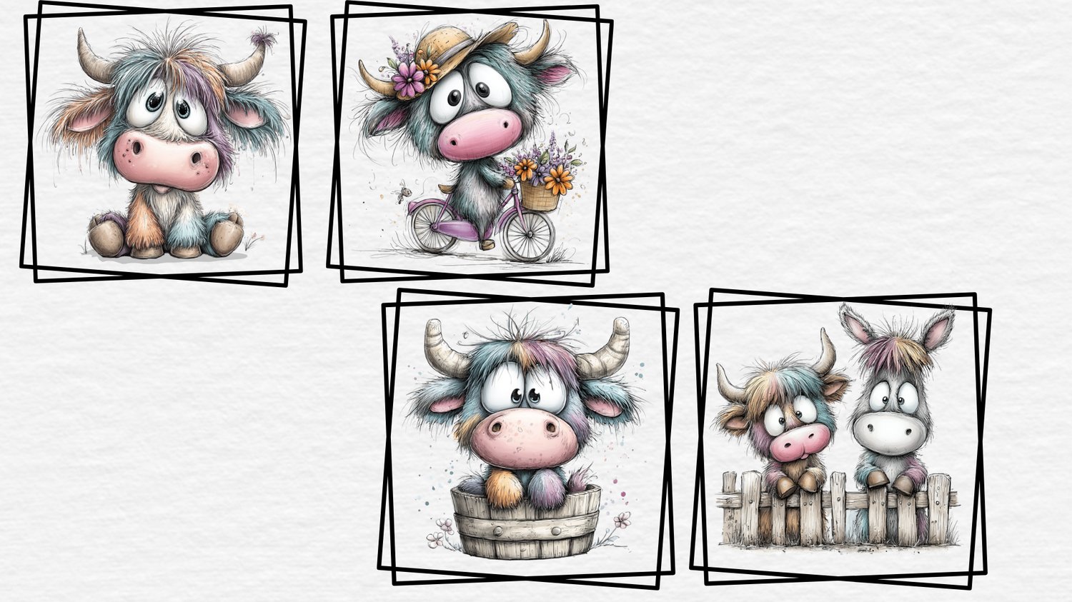 12 Unique High-Resolution Graphics: Featuring cows on fences, riding bicycles, and posing with floral baskets.