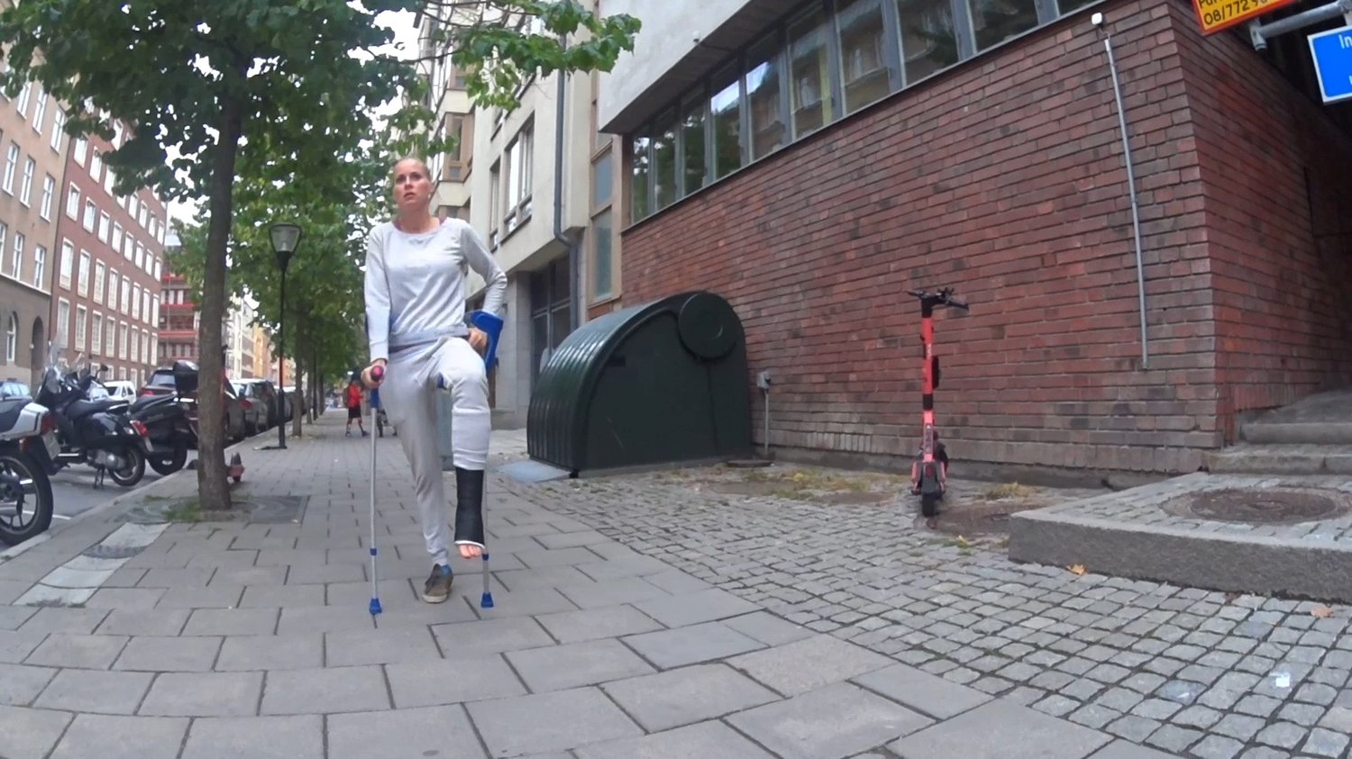 Zandy crutch along the street and when she gets tired she puts her casted leg up on one crutch so we can get a great loock at her cast and pretty toes.