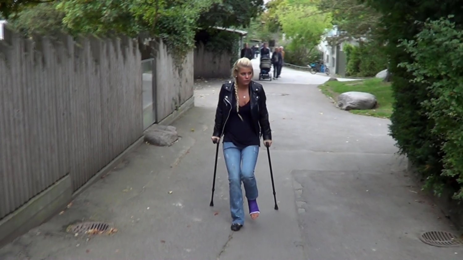 Ice sits on a bench and we get a nice closeup of her cast and cute painted toes.She starts crutching and holds her short leg cast up behind her so she not hits her toes in the ground.After a day at the Zoo is now time for her to go home and we follow her when she crutch back to the car.