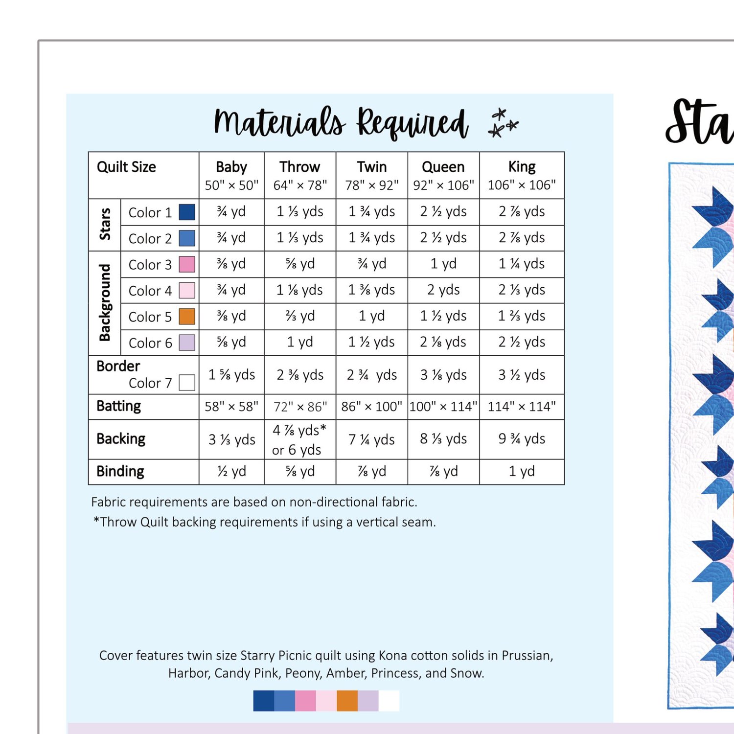 - Quilt sizes: Baby, Throw, Twin, Queen, and King