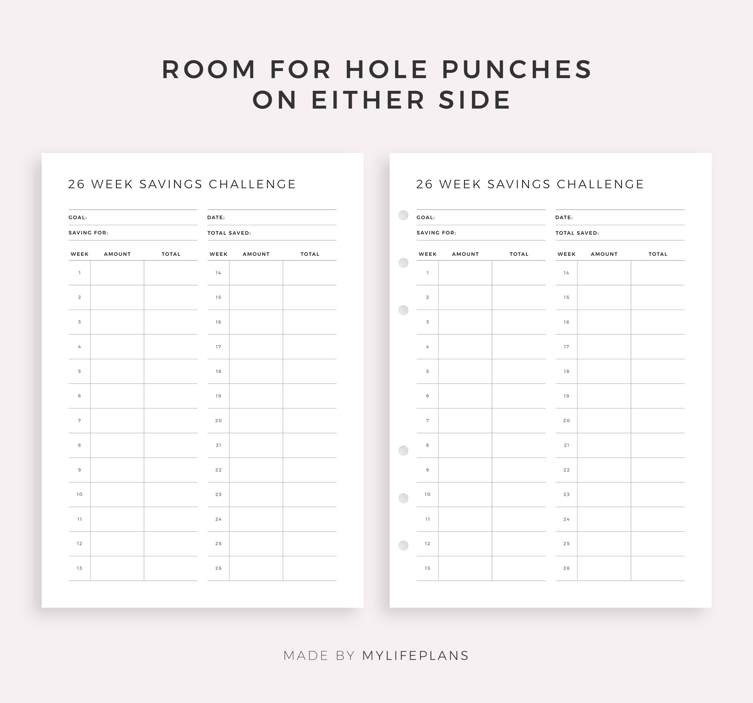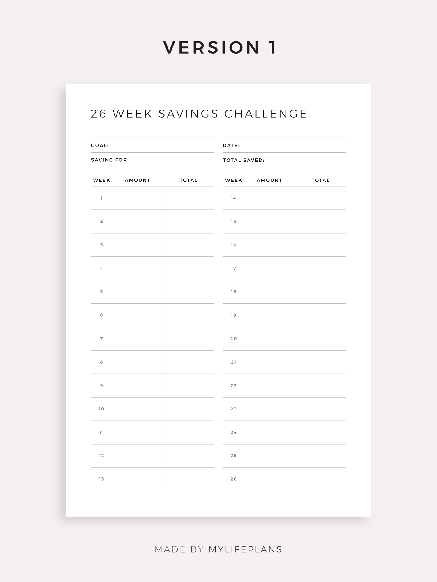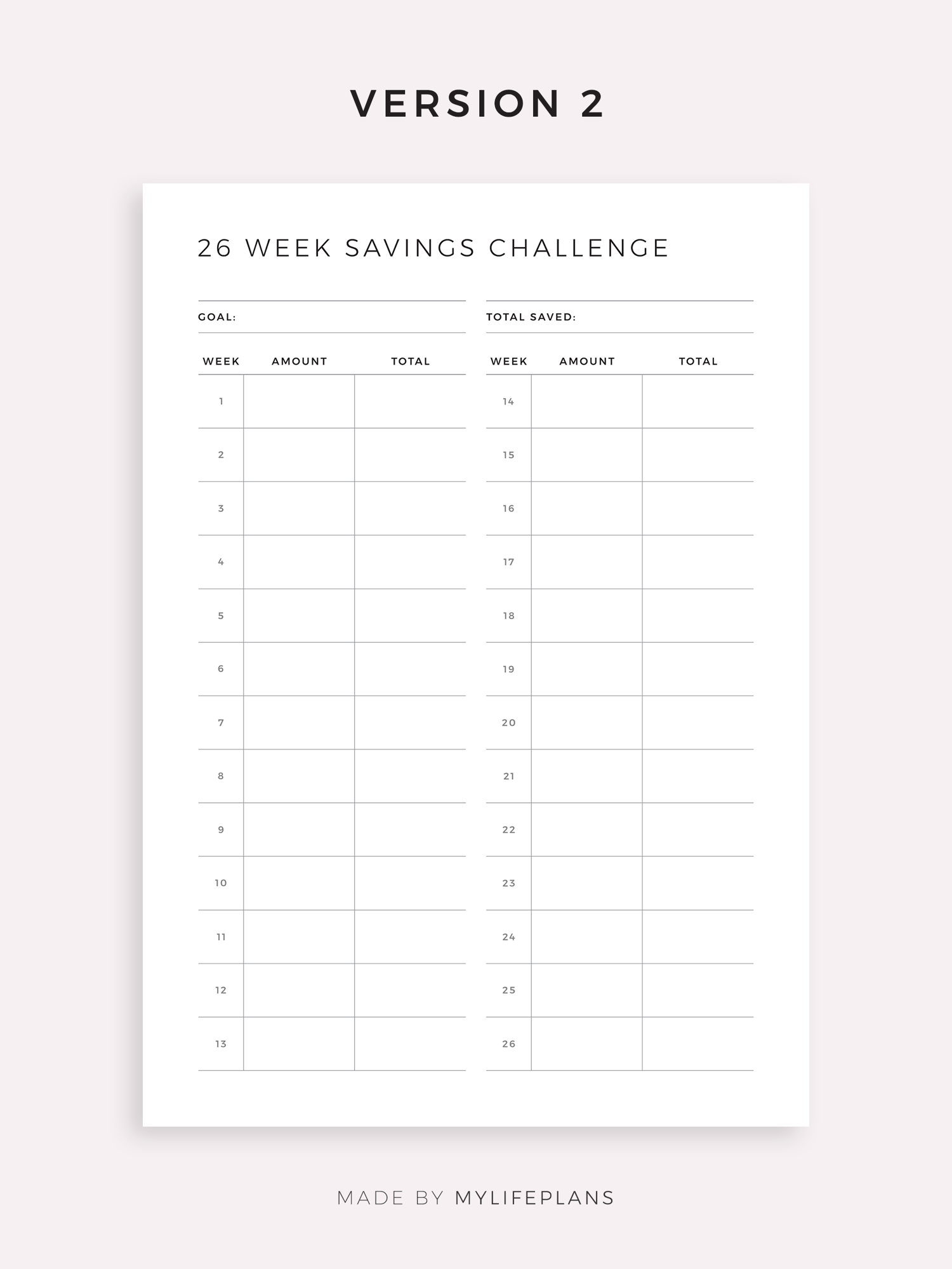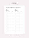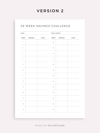 This is a printable 26 week savings challenge — just download, print, and start using it right away.