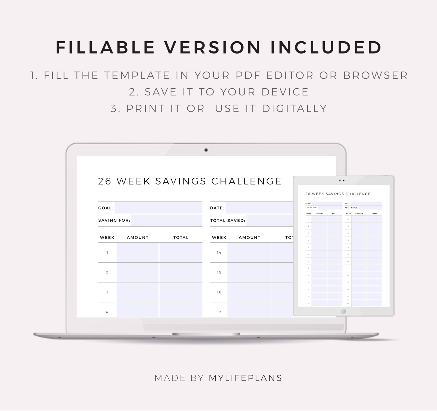 26 Week Savings Challenge, Printable & Fillable Template, A4/Letter Size