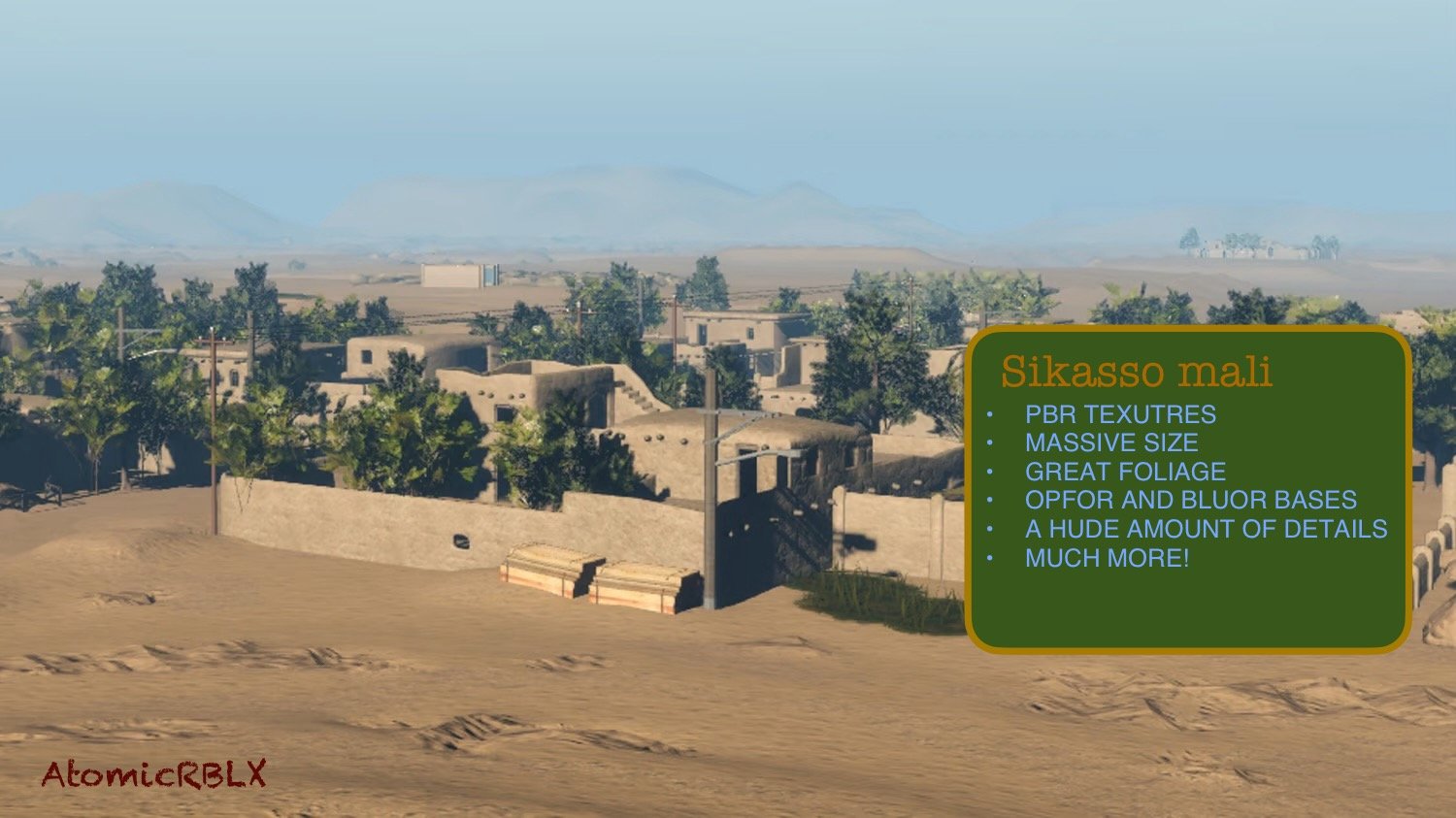 The map includes a large forest with thick foliage and exotic plants, the map also features a small town and many compounds and houses scattered all over the map. it also includes 2 bases: 1 blufor 1 opfor