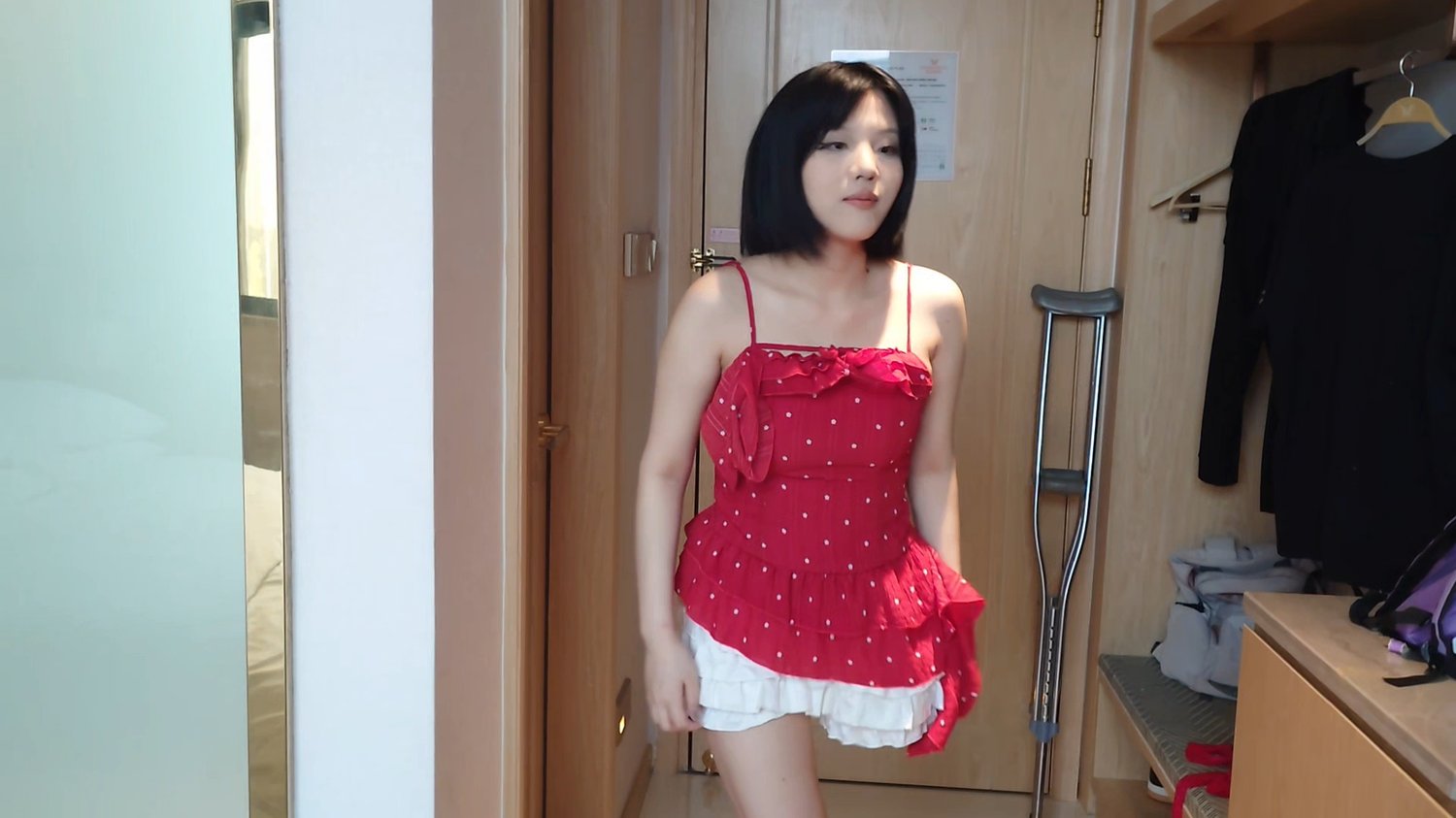 Lingo: Sak Amputee Girl wears a red strappy dress, showcasing her amputated limb.