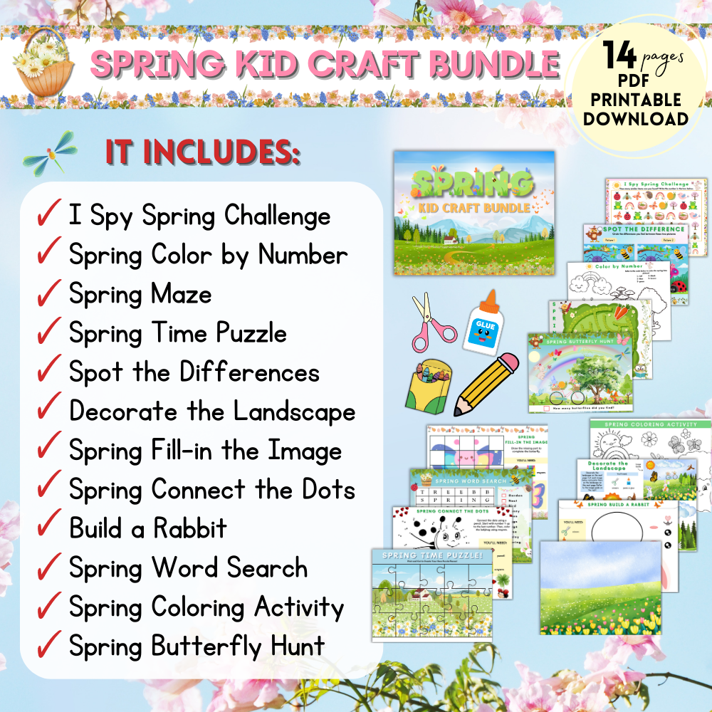 Get ready to leap into creativity this spring with our delightful Springtime Kid Craft Bundle! Bursting with fun and engaging activities, this collection is designed to spark your child's imagination while celebrating the vibrant season of renewal. From exciting "I Spy" spring challenges that sharpen observation skills to the joy of building an adorable paper rabbit, each printable offers endless opportunities for learning and laughter.