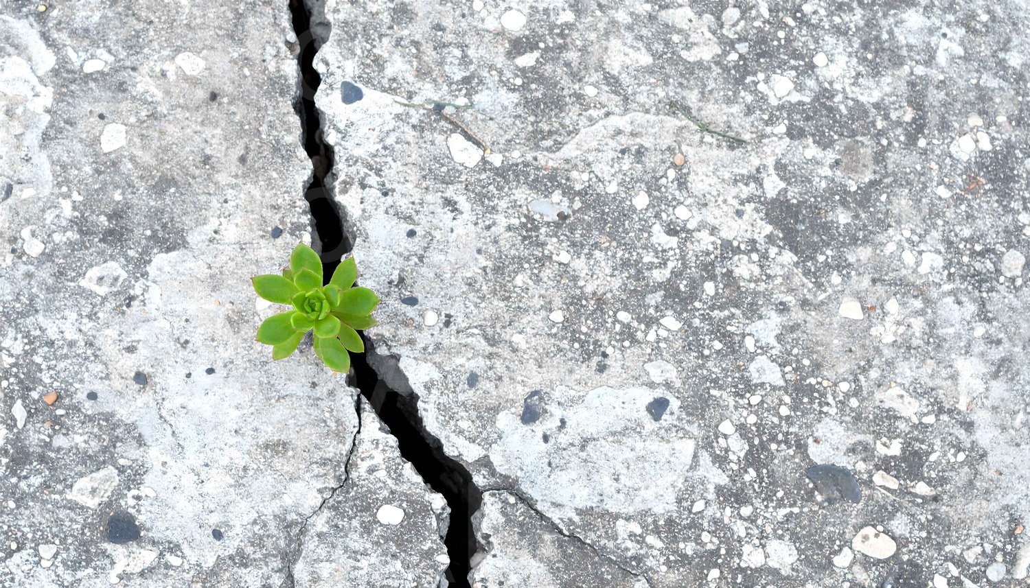 This powerful and inspiring visual captures the sight of a small but strong green succulent growing from a wide crack in a hard concrete surface. This image metaphorically represents resilience, hope, and the ability to thrive despite difficult conditions. It's a perfect visual for projects related to motivation, growth, and innovation.