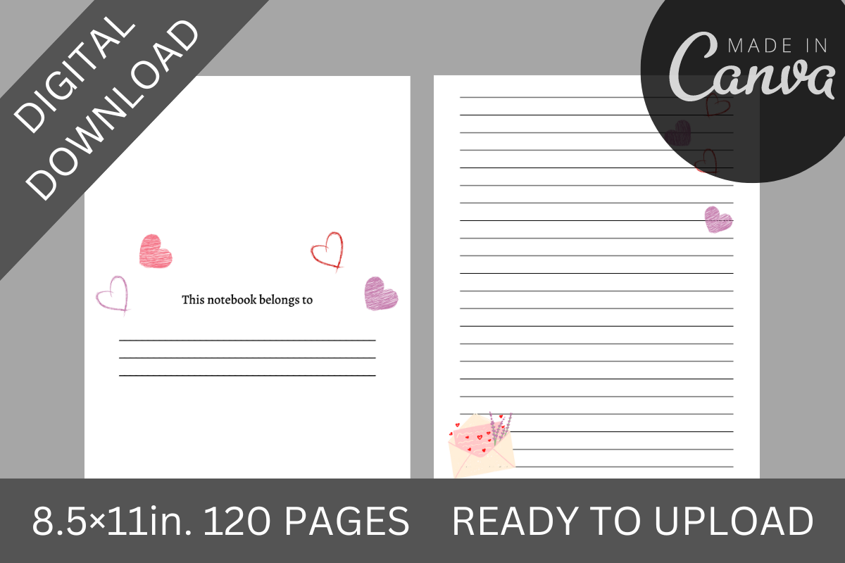 LOVE THEMED KDP LINED PAPER INTERIOR, LOW CONTENT BOOK FOR KDP READY UPLOAD, VALENTINE KDP JOURNAL PAPER, JOURNAL NOTEBOOK MOCKUPS, KDP CANVA NOTE