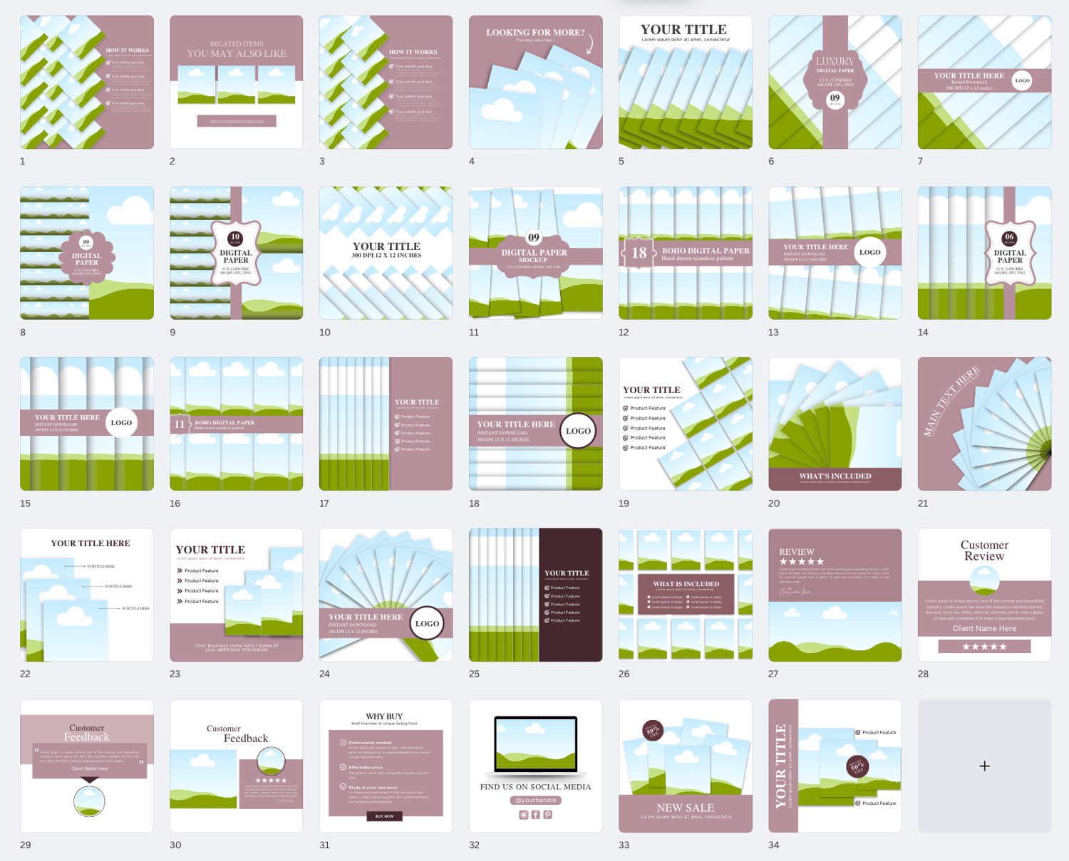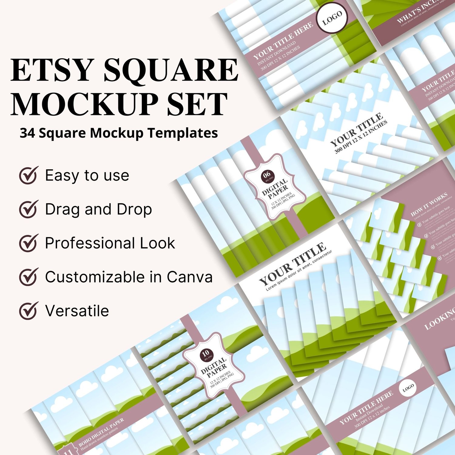 Elevate your online shop with these Square Mockup Templates, designed specifically to help you create professional, eye-catching product listings. This editable Canva template set includes 34 unique mockup layouts ideal for showcasing digital paper, review templates, and other square-format products.
