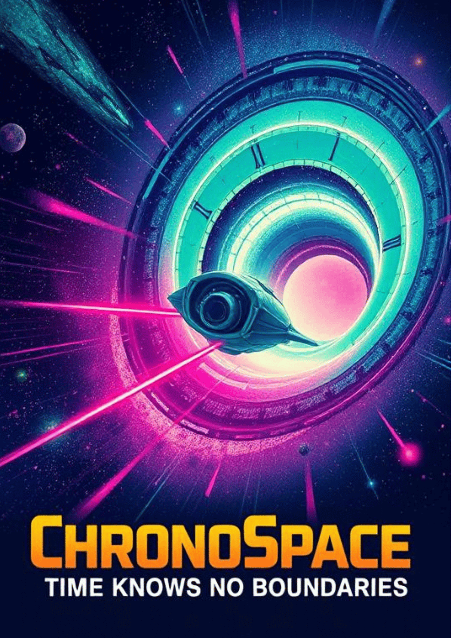 Travel through time and space with this eye-catching 1950s retro-style movie poster, featuring a futuristic spaceship navigating a swirling wormhole. The neon greens, purples, and pinks create a vivid scene of time and space bending in front of your eyes. Perfect for fans of both time travel and retro space adventures.