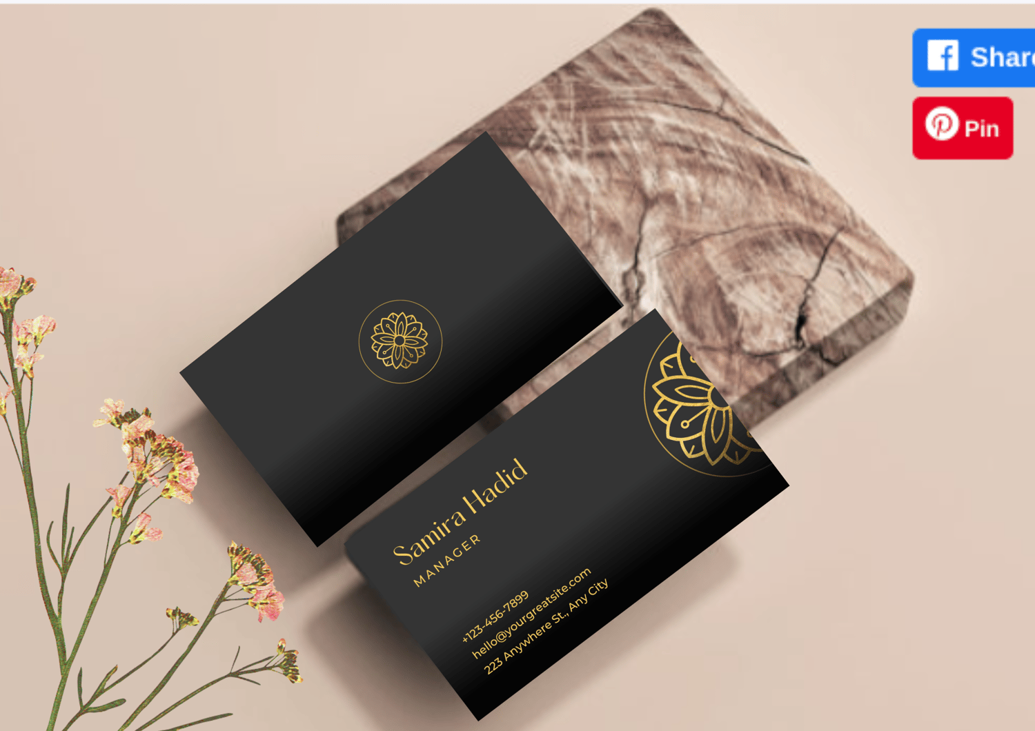 Hash tags> #BusinessCard #MinimalistDesign #GoldAndBlack #ElegantFlower #ProfessionalLook