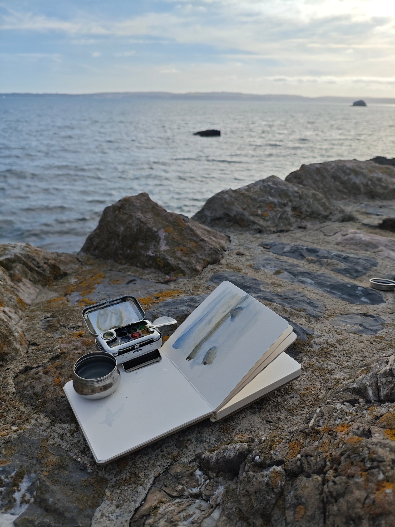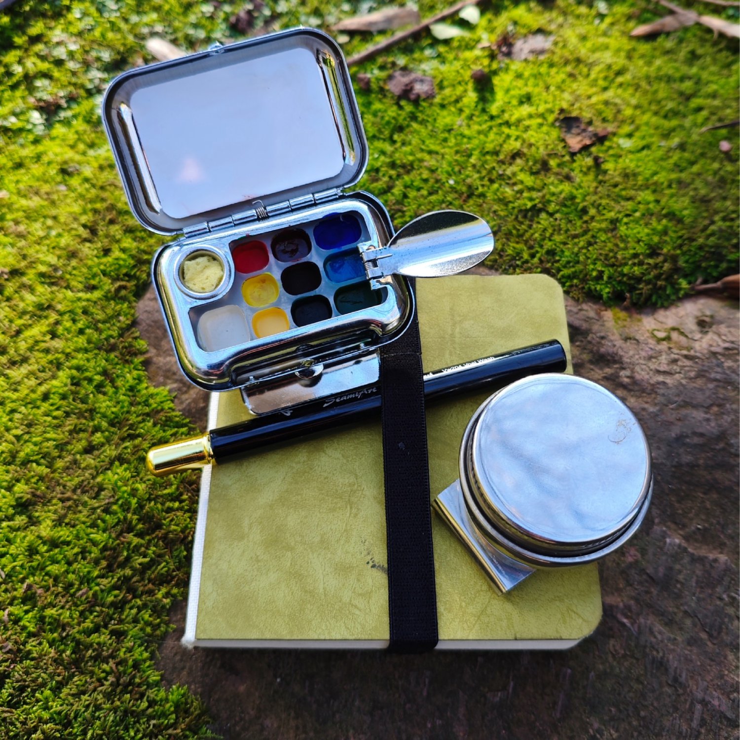 A compact and high-quality portable kit designed for watercolour or gouache painting. Each set includes a beautifully made metal paint tin with pans, a metal dipper, a portable brush, a sketchbook suited to wet media, and paint included — everything you need to get started.