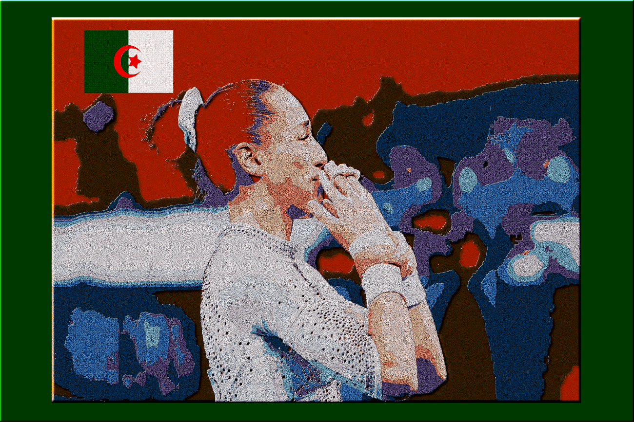 Captured during the 2024 Paris Olympics, this stunning image features Kaylia Nemour celebrating her gold medal victory in the uneven bars final. Despite her French training background, Nemour competed for Algeria, showcasing her incredible performance with two hands sending kisses to the cheering crowd.