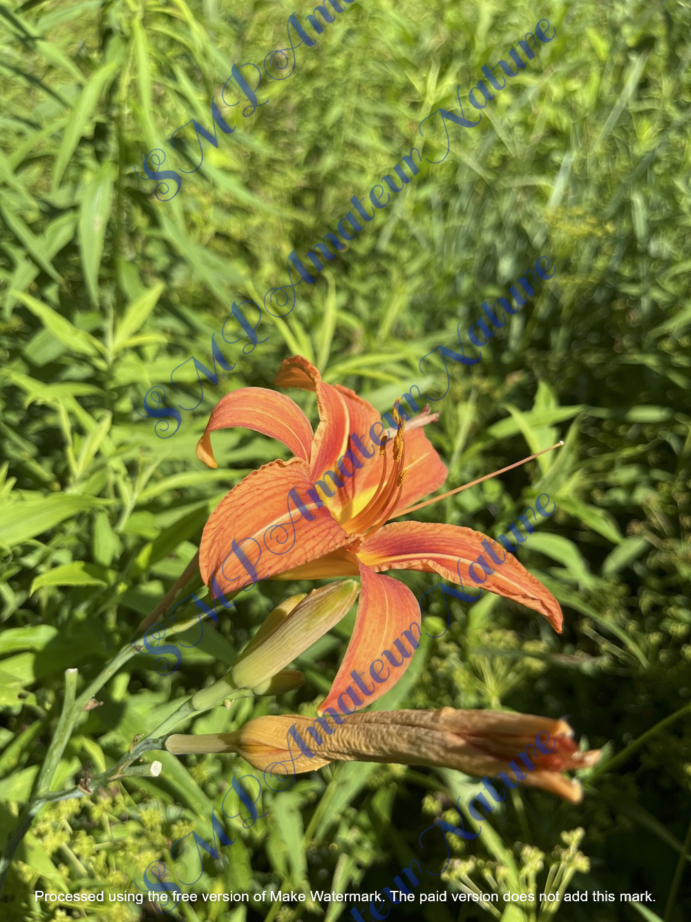 Amateur photographs of Orange Day-Lily (Hemerocallis fulva) flowers in a garden. Image taken in Virginia, USA. Image pixels 3024x4032. Image easily resized as required for buyer needs. Purchase gives image without any watermark.