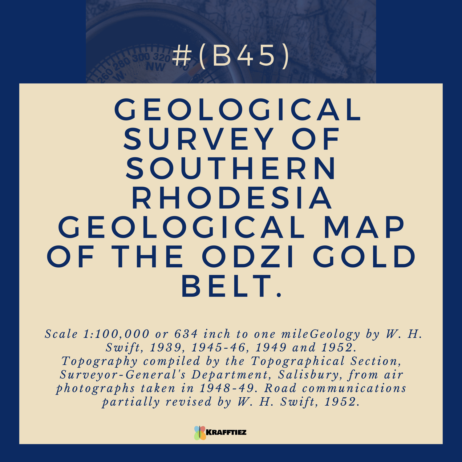 (B45) GEOLOGICAL SURVEY OF SOUTHERN RHODESIA GEOLOGICAL MAP OF THE ODZI GOLD BELT. Scale 1:100,000 or 634 inch to one mileGeology by W. H. Swift, 1939, 1945-46, 1949 and 1952.Topography compiled by the Topographical Section, Surveyor-General's Department, Salisbury, from air photographs taken in 1948-49. Road communications partially revised by W. H. Swift, 1952.