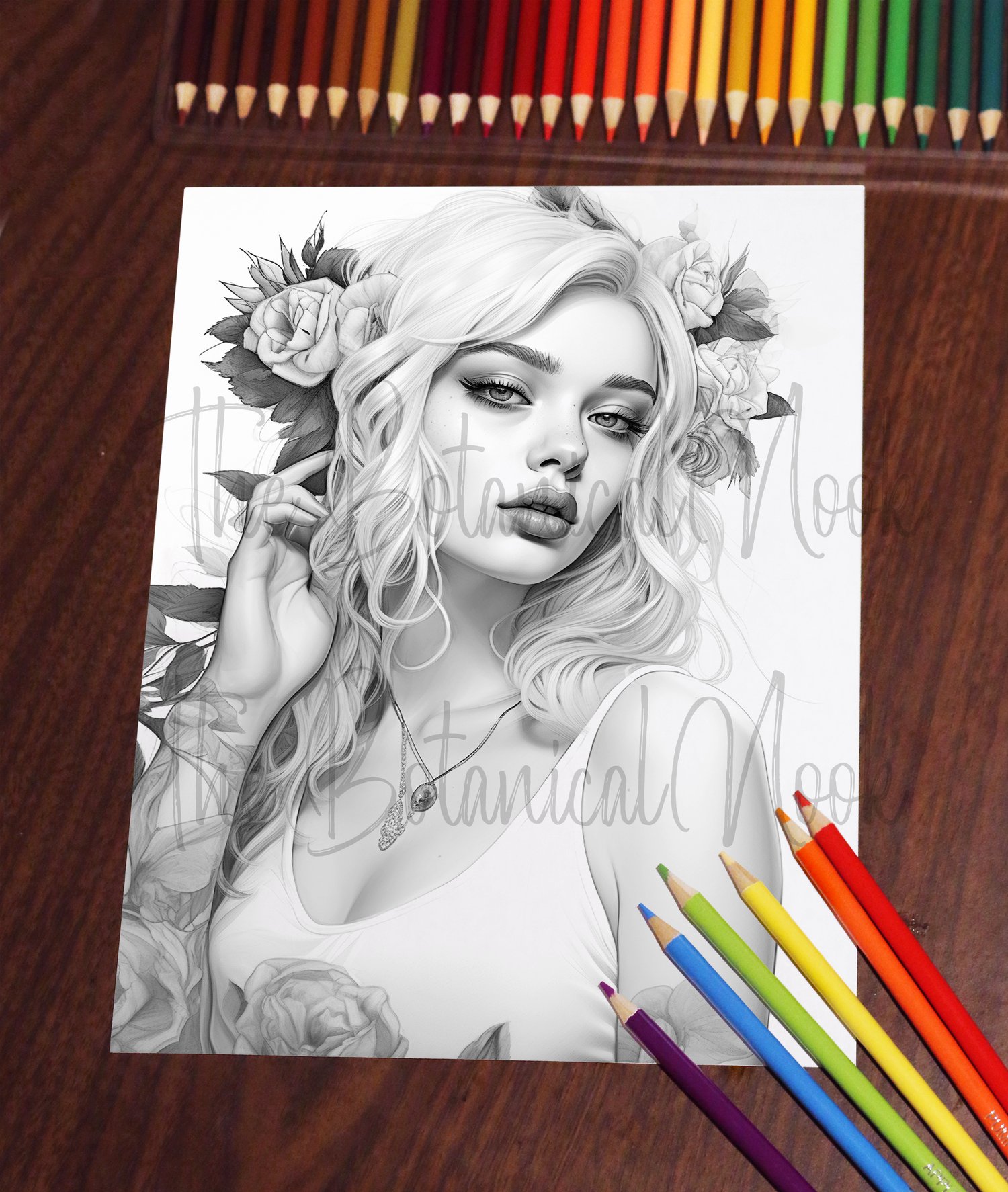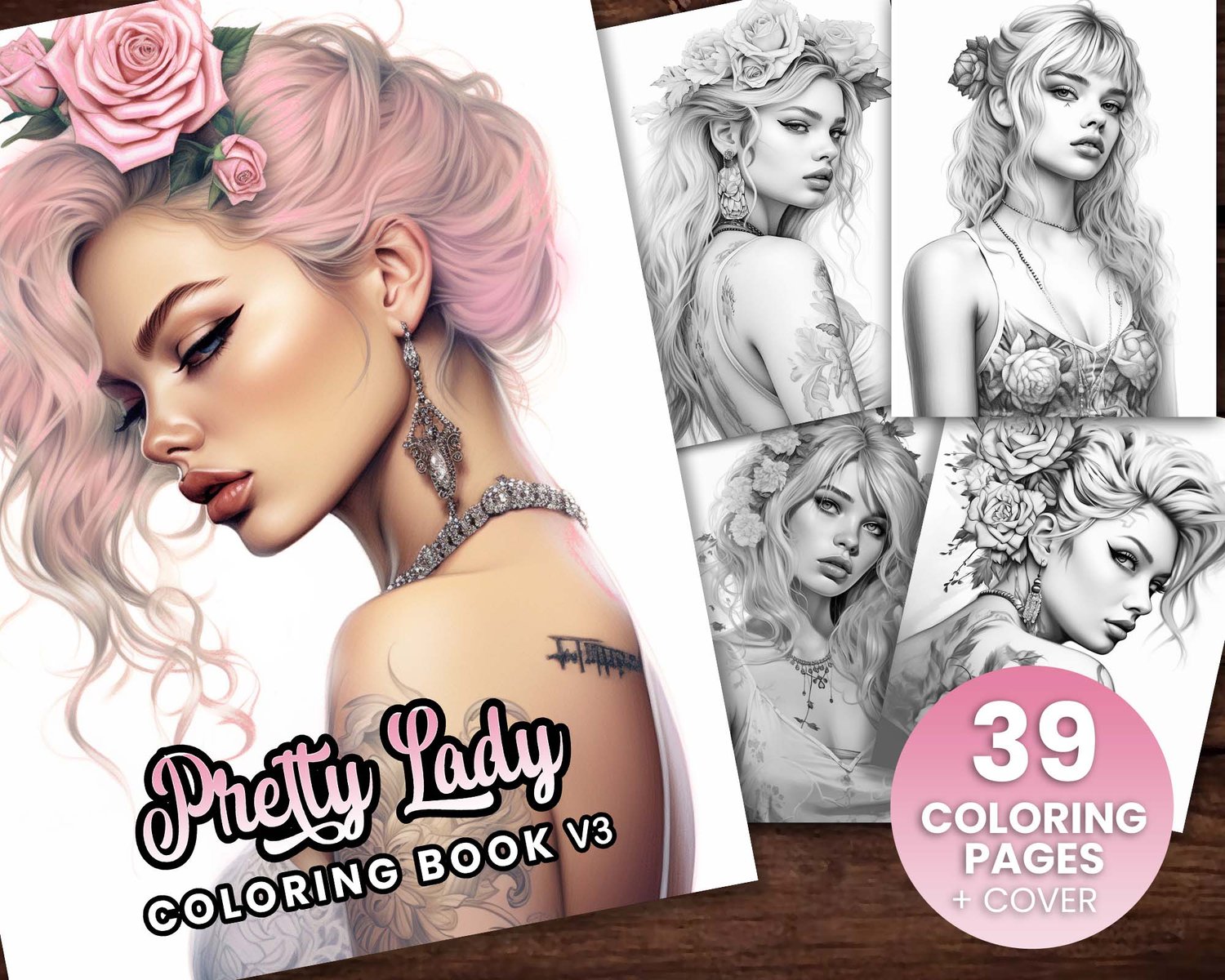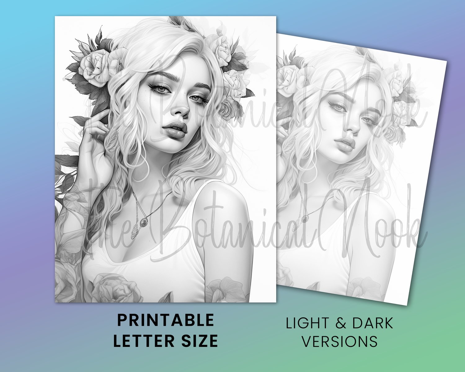 39 Pretty Lady V3 Beautiful Women, Hair, Flowers Coloring Page Book, Adults + kids Instant Download- Grayscale Coloring - Gift Printable PDF
