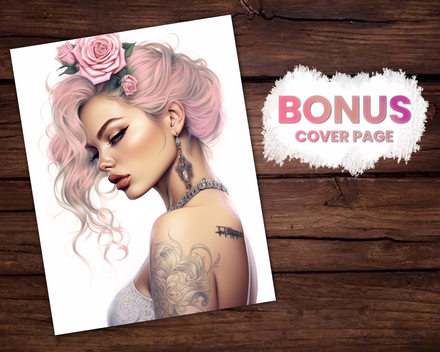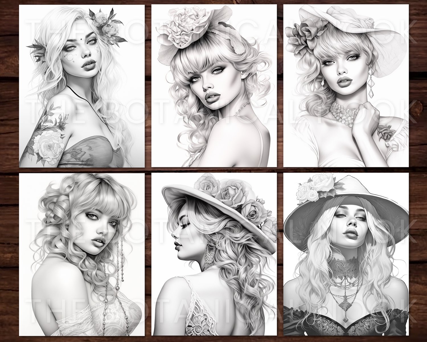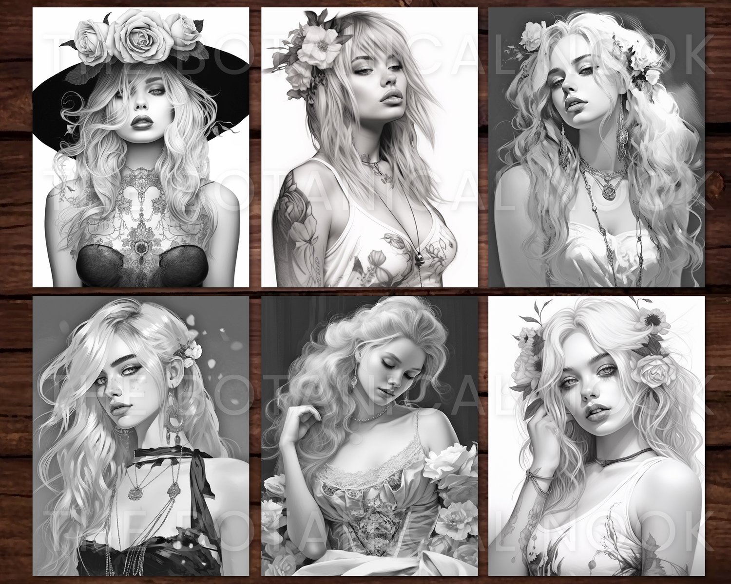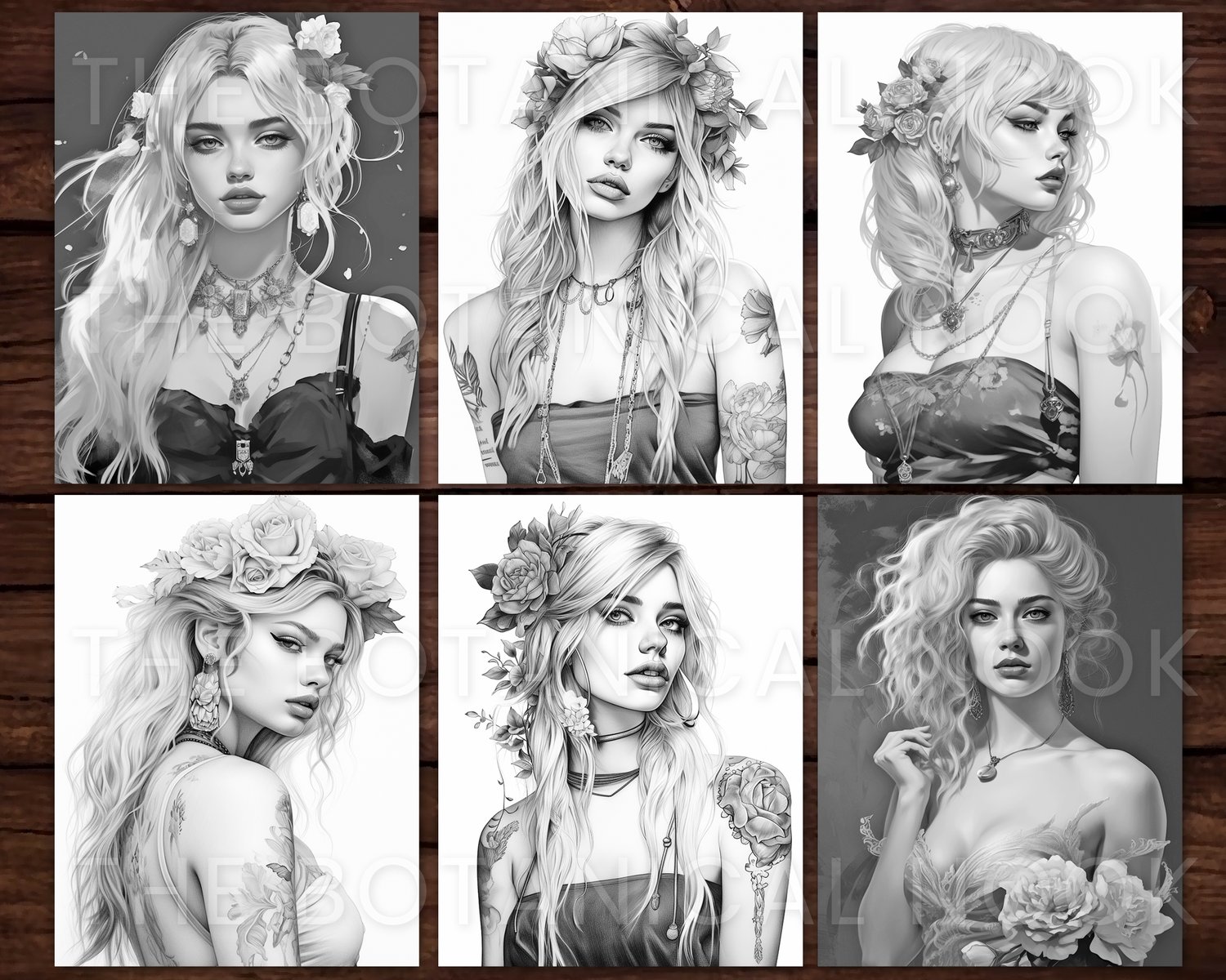 39 Pretty Lady V3 Beautiful Women, Hair, Flowers Coloring Page Book, Adults + kids Instant Download- Grayscale Coloring - Gift Printable PDF