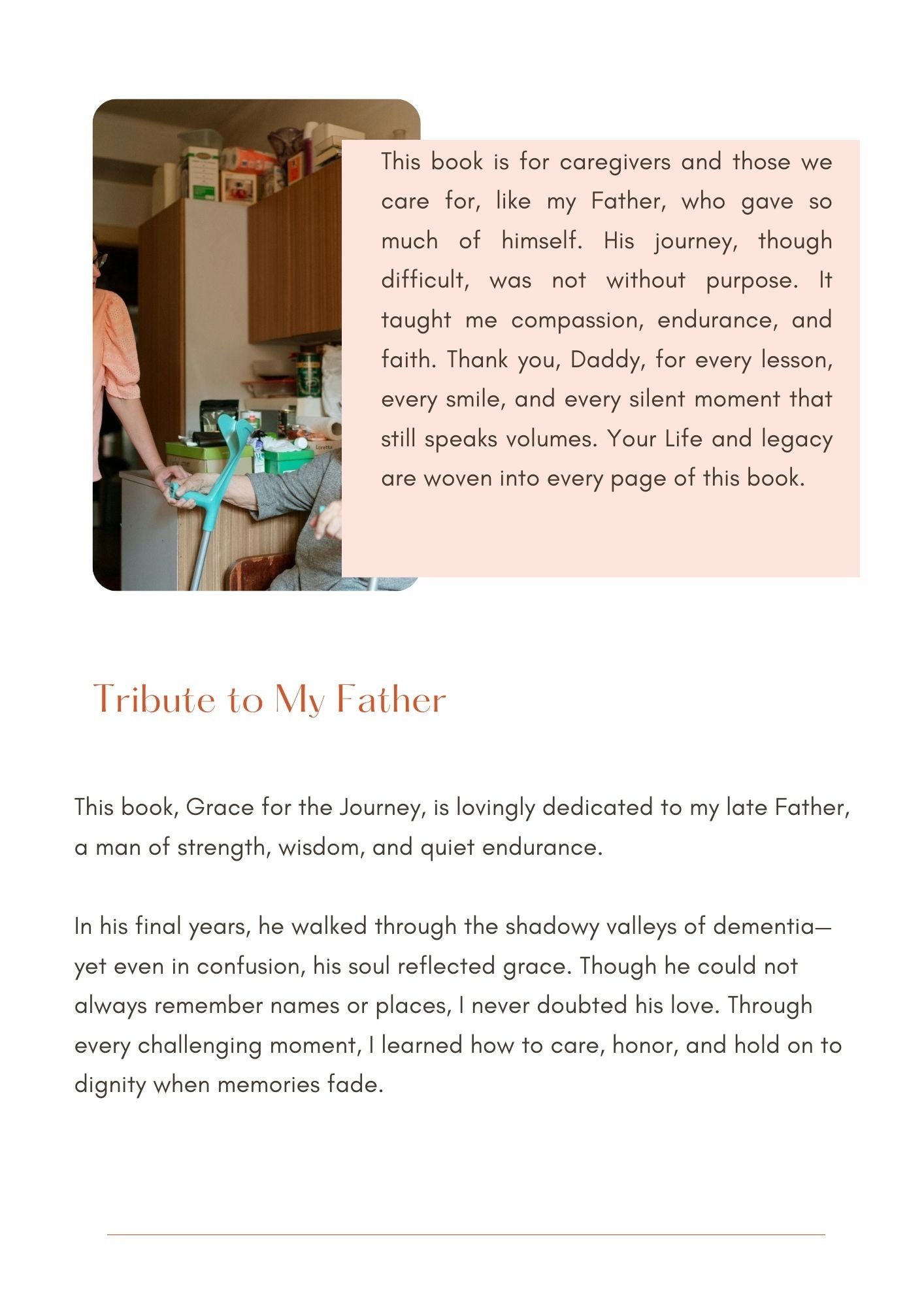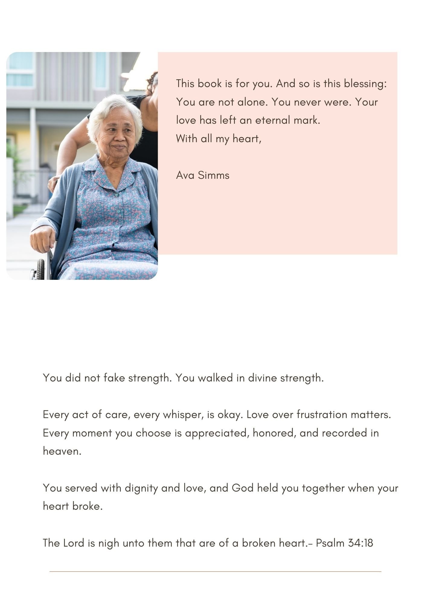 Written from a place of lived experience and unwavering faith, this book weaves reflections, prayers, and helpful insights to remind caregivers that they are not alone. Whether you’re overwhelmed, weary, or searching for peace, you’ll find strength in these pages to carry on gracefully.
