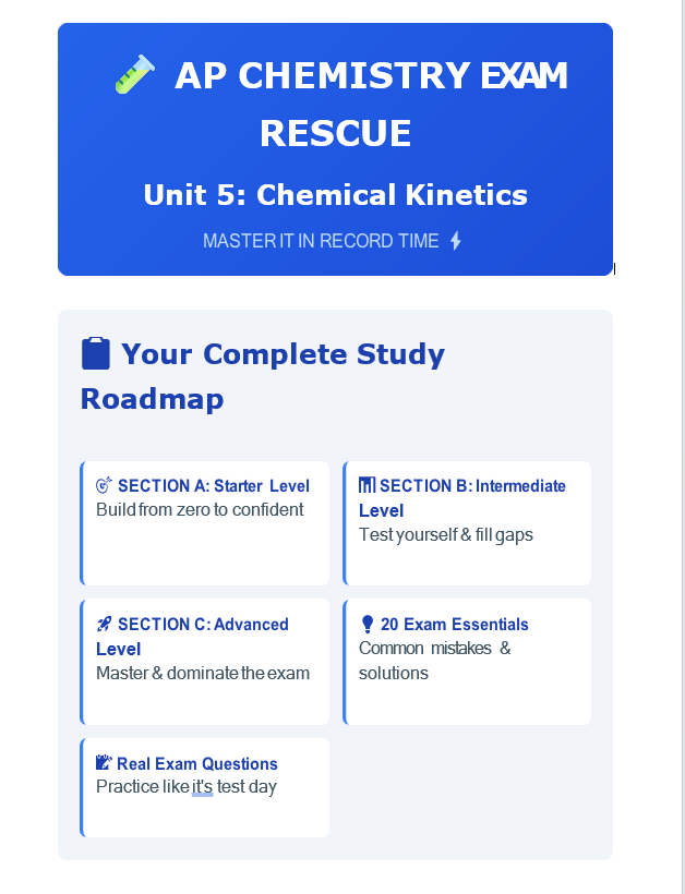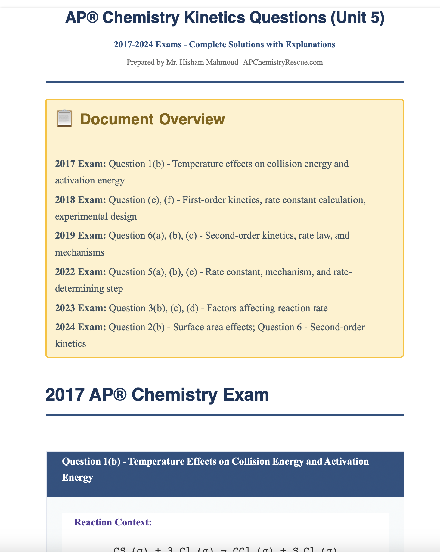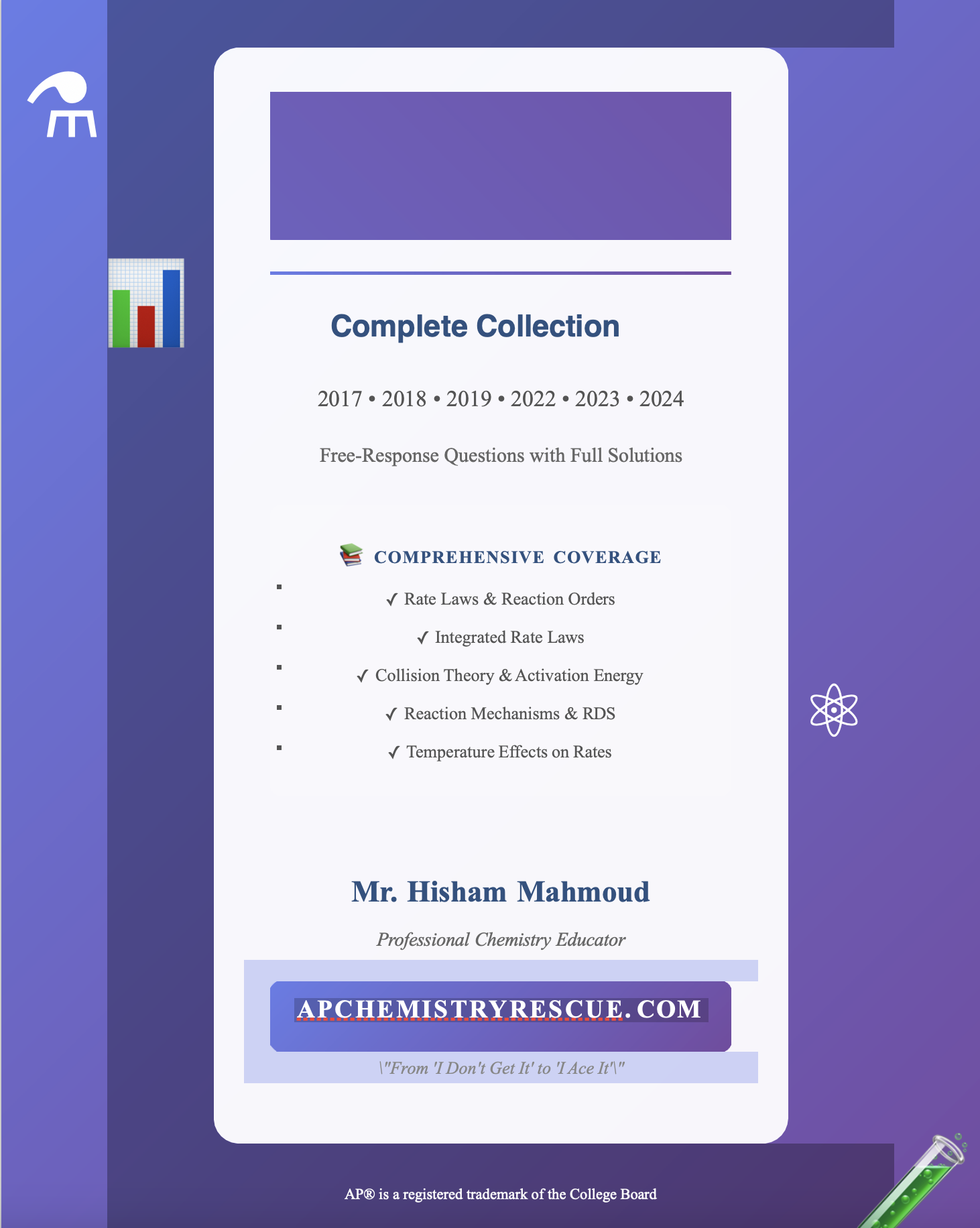 Unlock your kinetics mastery with this comprehensive collection featuring complete, step-by-step solutions to every Unit 5 free-response question from 2017-2024 exams—covering rate laws, integrated kinetics, collision theory, mechanisms, activation energy, and Maxwell-Boltzmann distributions. Each question includes detailed explanations, calculation breakdowns, and Mr. Hisham's insider tips that transform complex concepts into crystal-clear understanding, giving you the exact blueprint successful students use to score 5s on the AP exam. No more guessing, no more confusion—just proven strategies from a 7+ year AP Chemistry veteran who's helped hundreds of students go from "I Don't Get It" to "I Ace It." This isn't just another answer key; it's your personalized kinetics tutor in document form, complete with color-coded sections, chemical equations, and targeted practice that mirrors actual exam questions. Stop struggling and start scoring—download now and join the ranks of confident, high-achieving AP Chemistry students at APCHEMISTRYRESCUE.COM! 🚀🧪