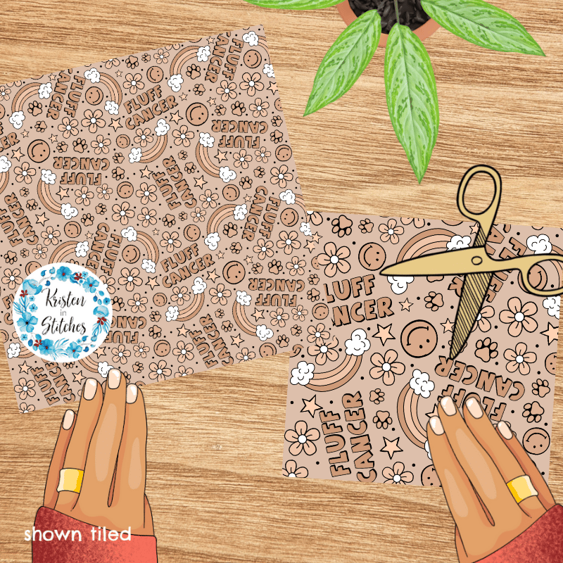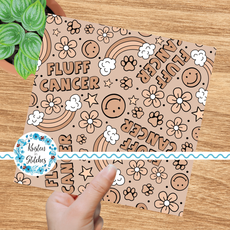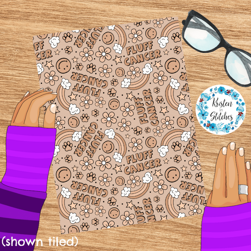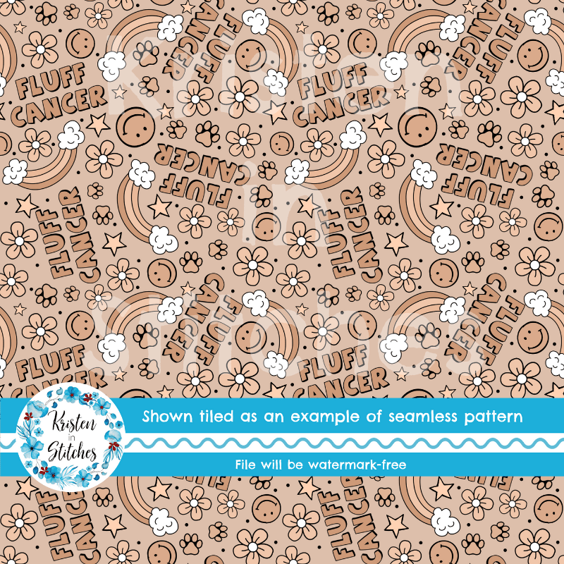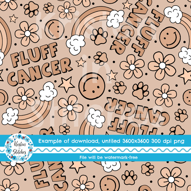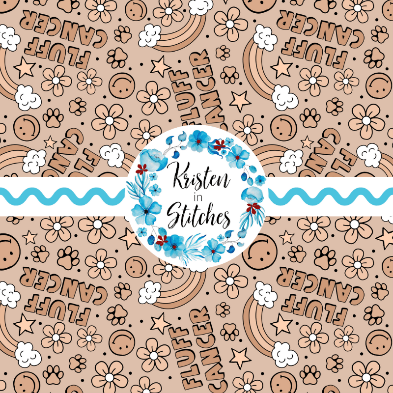 Fluff Cancer design with rainbows, paw prints, smiley faces and flowers.