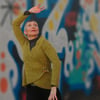 The collar, the waist line and the bottom borders form three dynamically curved lines converging on the front tips of the cardigan.