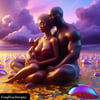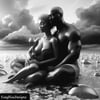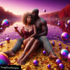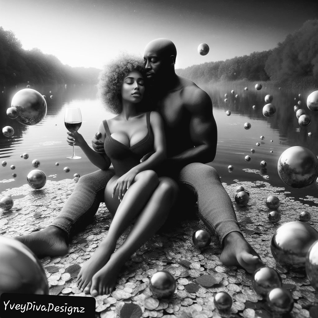 A black couple sits serenely on a mystical beach where iridescent bubbles brew from the sands, dancing in the air like gentle whispers of their love. As the vibrant hues of the bubbles reflect their connection, they embrace the beauty of the moment, lost in each other and the magical world around them.