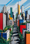 “Soul of the Modern City” pulses with vibrant energy, capturing the dynamic interplay of towering skyscrapers and geometric blocks in bold hues of orange, blue, and green. Sunlight streaks between the buildings, illuminating bustling streets and patches of lush trees that line the avenues. The stylized perspective draws the eye forward, evoking both the grandeur and rhythm of urban life, while the interplay of color and light speaks to the creative harmony that defines the spirit of the contemporary metropolis.