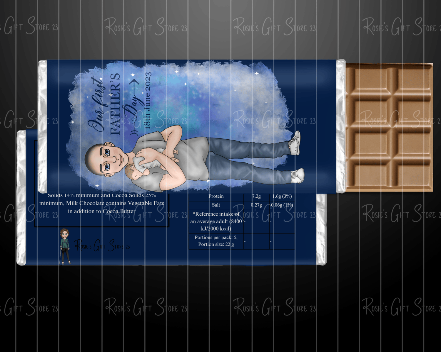 you will find 3 different sections in different colours with writing on. Sticky side (Part you use to stick tape/glue to, Front where you design your chocolate wrapper and the nutrition information to put such details. After making your design you will then hide these sections leaving just your design. Black box is to help you to know where to trim once printed but if you prefer you can hide is part to but please not not move the parts as they are where they should be. This chocolate wrapper template is for 110g chocolate bar, you may need to adjust chocolate wrapper 0.5cm all round.