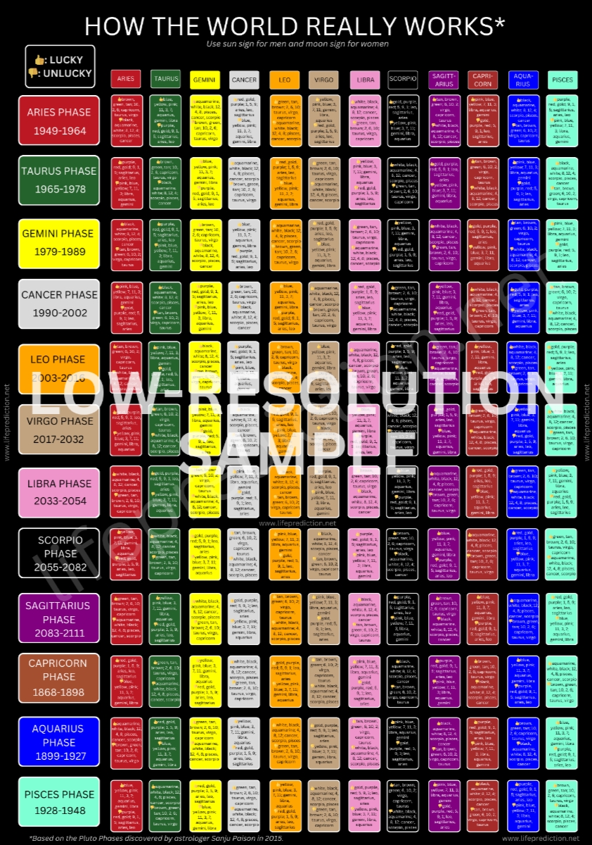Reference sheet for lucky and unlucky colors, numbers and people (their zodiac signs) for every zodiac sign during each of the 12 Pluto Phases. Discovered by astrologer Sanju Paison in 2014.