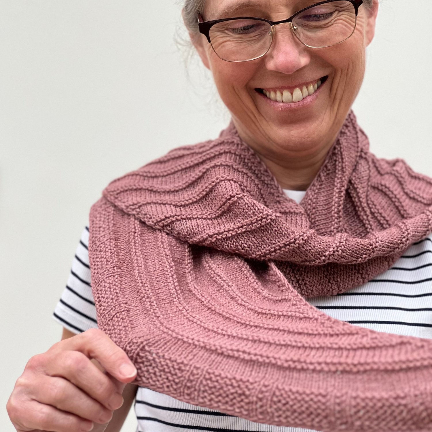 The stitch pattern consists of two garter stitch ridges on a stocking stitch background. This pattern is repeated throughout the shawl until the border is reached. The border is knitted in a garter stitch rib pattern.