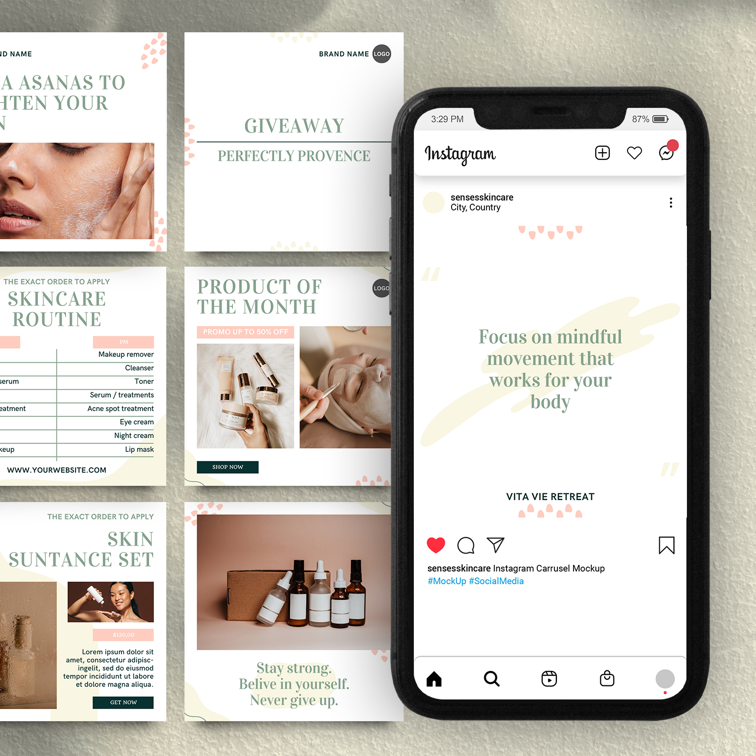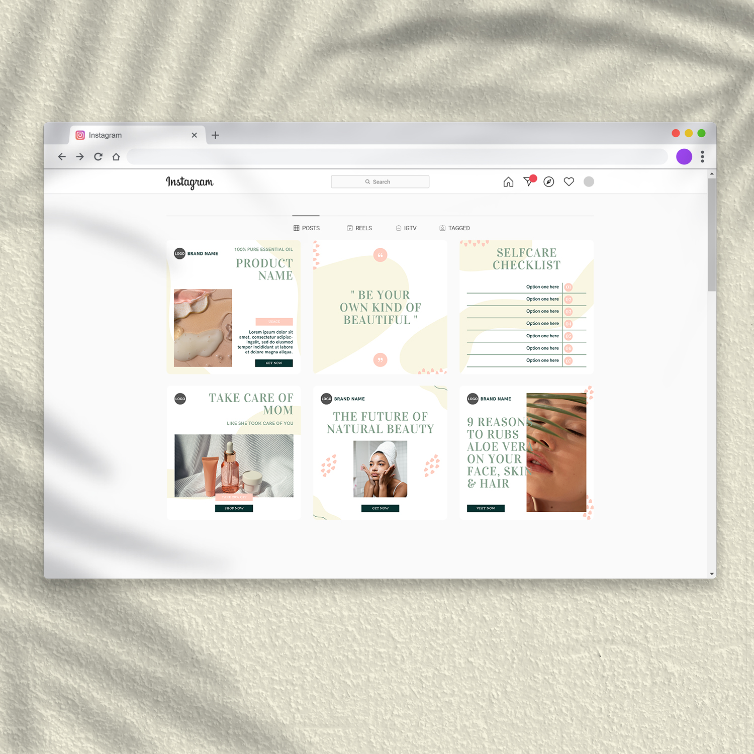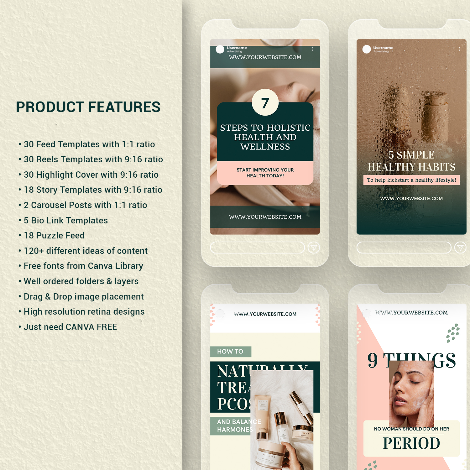 - 25 Reel Templates: Share dynamic product demonstrations, skincare tips, and self-care inspiration with captivating, engaging designs.