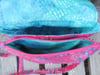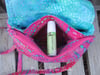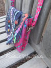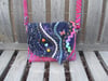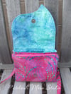 This sweet cross body bag is like wearing a piece of fiber art with the decorative stitched and embellished flap. The entire bag is made using cotton batik fabrics inside and out. The bag features a flap that is closed with a magnetic snap. Under the flap there are 3 compartments: a zippered pocket, an open section and a hidden center section for smaller items (see photo with the lip balm holding open the pocket). The two main sections are separate, yet sewn together. See the side photo.
