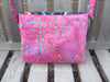 The bag measures about 8" wide x 6" high. It is a lightweight bag that is great for carrying just a few essential items with you. Makes a great bag for a younger woman to carry, like a teenager as it is not too large and it is equally great for an older women who doesn't want to carry a lot of stuff and likes bright colors. The strap is not adjustable, but it clips in place, so you can always add a different length or an adjustable strap that you already have, or remove the strap and it becomes a clutch bag.