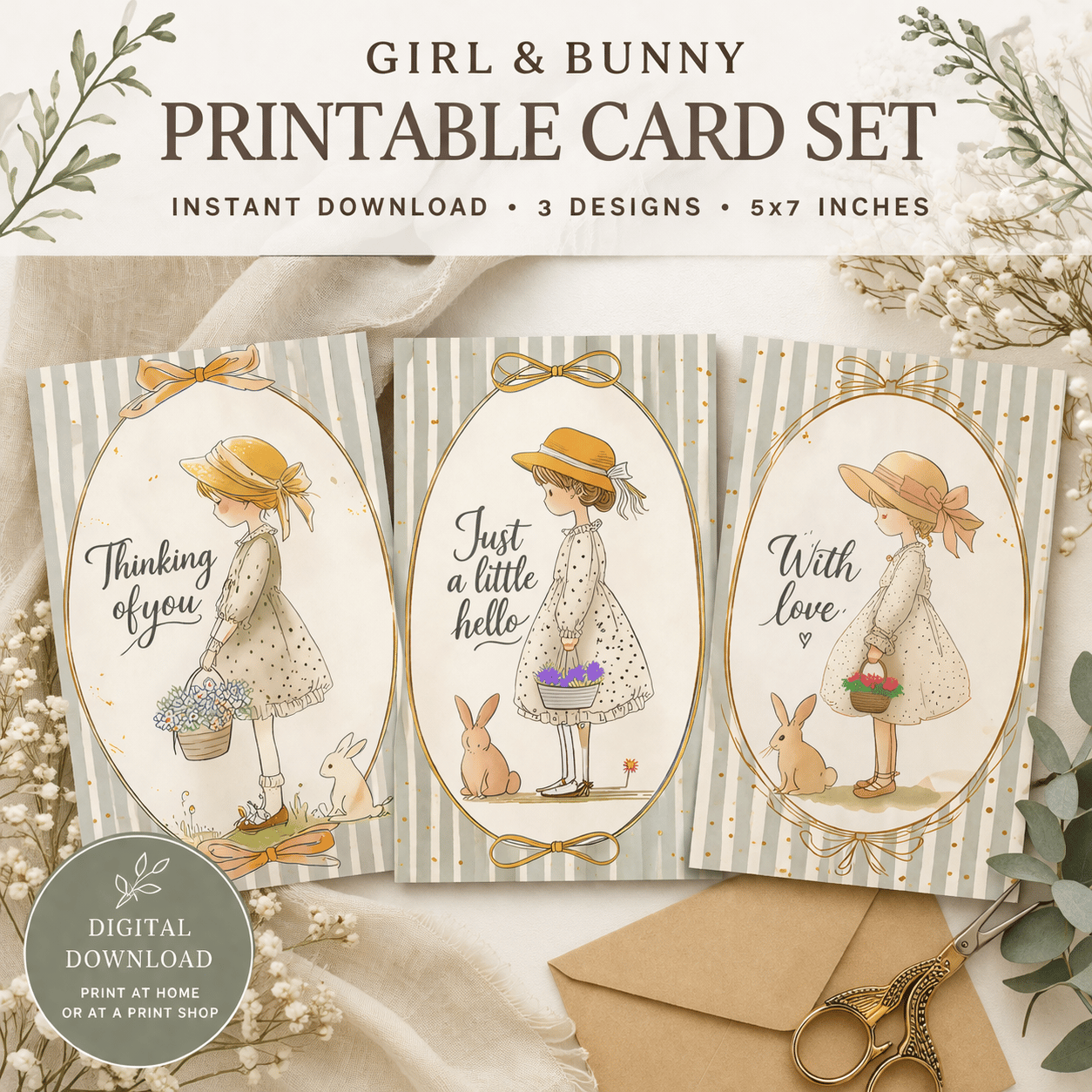A sweet and nostalgic set of three printable 5x7 greeting cards featuring charming girl and bunny illustrations in a soft vintage storybook style. Each design includes a gentle, heartfelt message, making this set perfect for everyday moments, thoughtful notes, and meaningful connections.