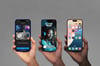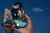 Photorealistic phone mockup pack featuring hands holding iPhone 15 models with changeable phone colors, editable Smart Objects and independent lights & shadows — 6000 × 4000 px at 300 DPI.