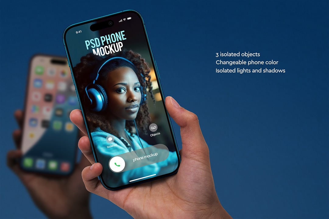 Phone Mockup – Hand Holding iPhone 15 (3 Isolated Objects)