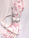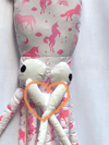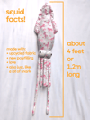 This one-of-a-kind squid is made of 100% upcycled fabric, in this case a soft, gently fuzzy poly-cotton with a pattern of pink unicorns and pink rainbows, with white cotton for the underside and eyes. (The pupils are made of felt, and handsewn, not embroidered.) Each one is unique--no exact colour combination is repeated and there are only limited amounts of each upcycled fabric in any case--and has its own personality. The squid is about 4' long (or 120cm), but half of that length is noodly appendages.