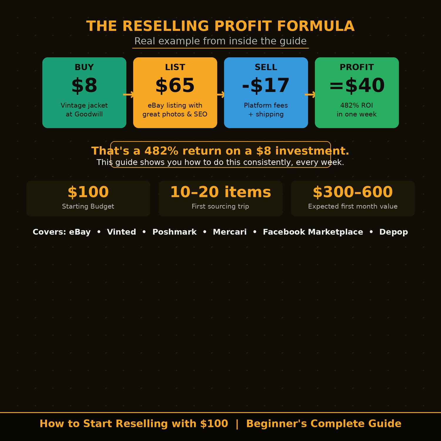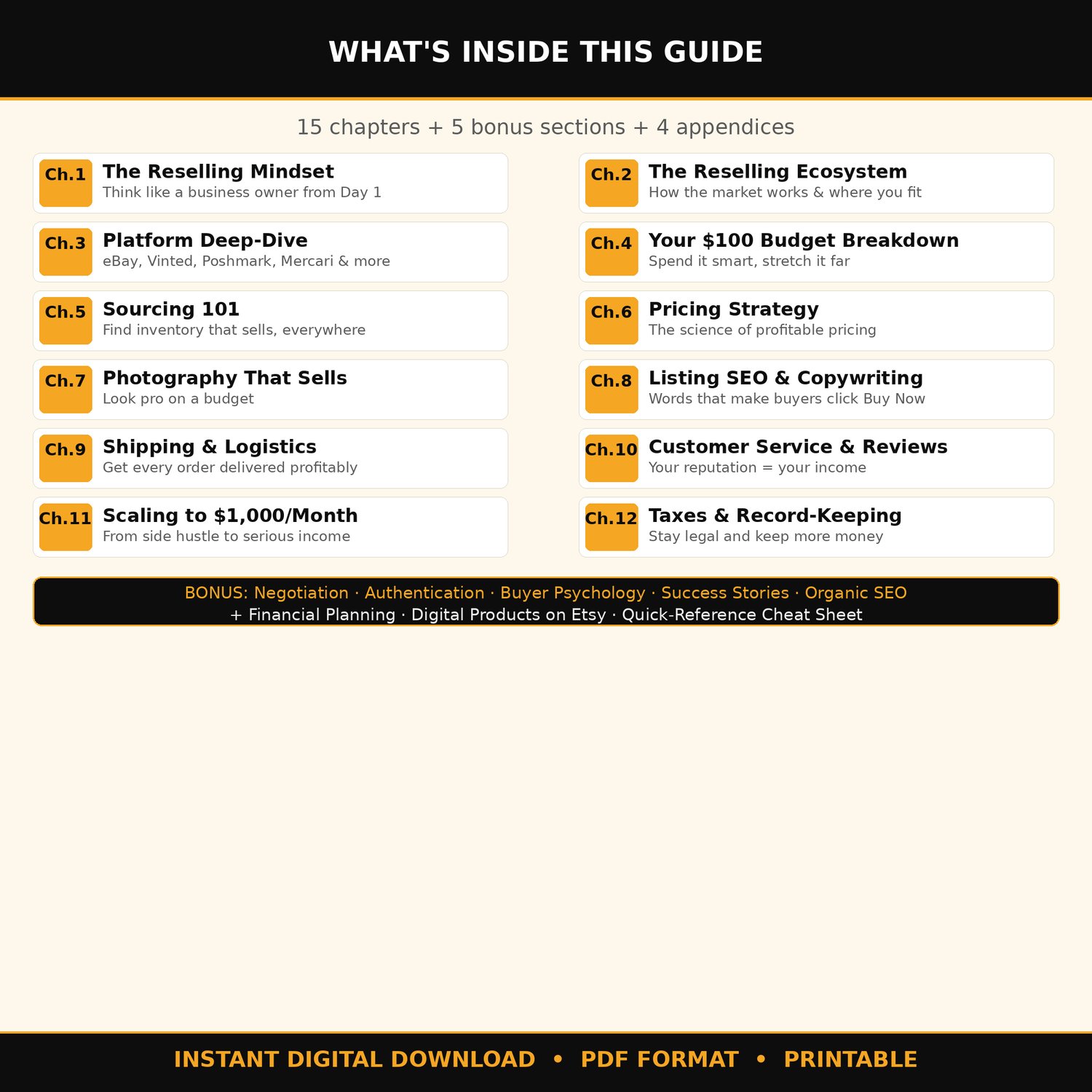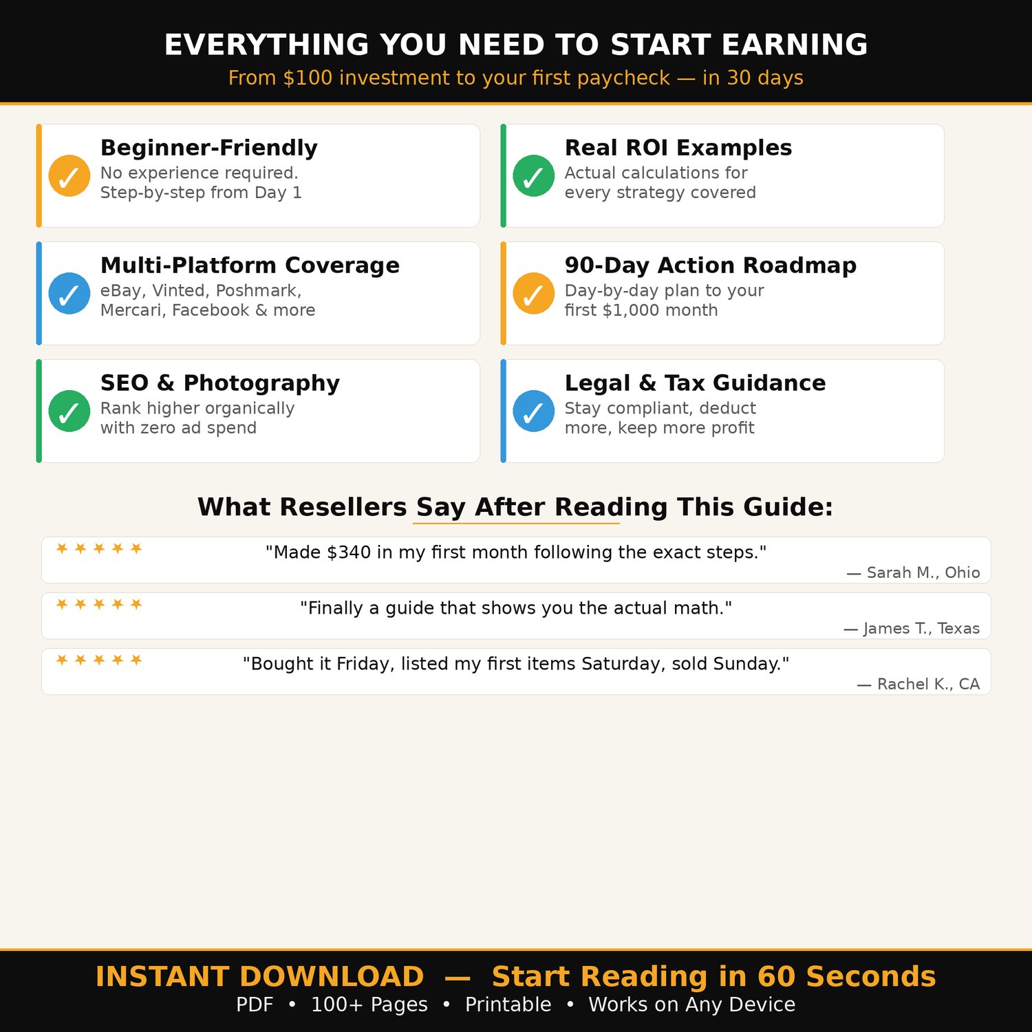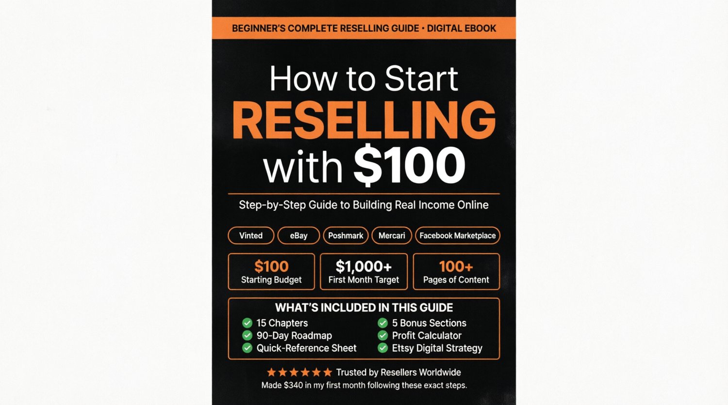 "How to Start Reselling with $100" is a 100+ page comprehensive eBook that takes you from complete beginner to confident reseller in 90 days or less. No fluff, no theory — just the exact systems, scripts, formulas, and strategies that work on eBay, Vinted, Poshmark, Mercari, and Facebook Marketplace right now.