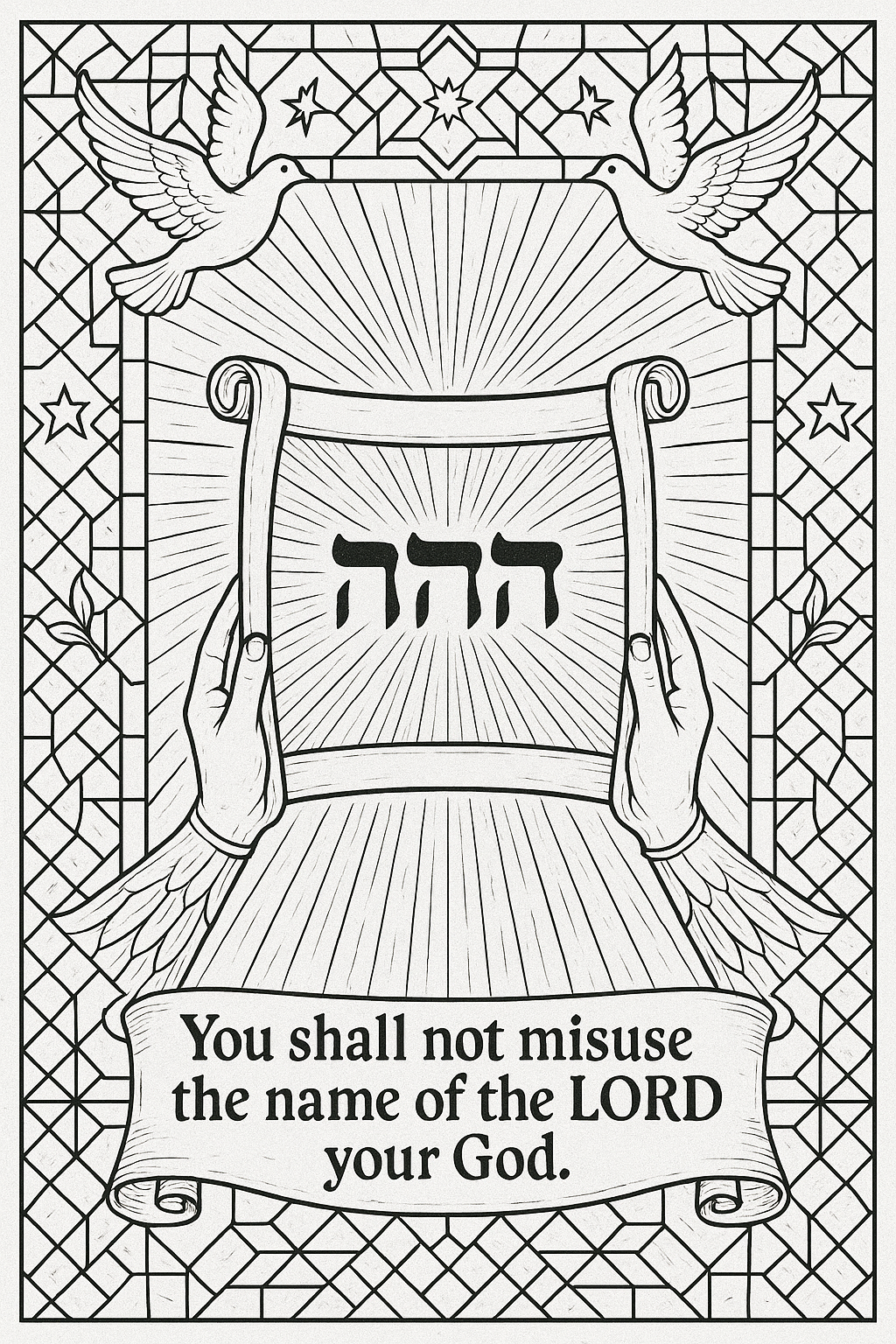 Honor the sanctity of Godβs name with this Sacred Scroll Coloring Page, featuring two hands reverently holding a scroll inscribed with ΧΧΧΧ (YHWH) β the divine name β surrounded by doves, radiant beams, and a stained-glass inspired backdrop. Paired with the command βYou shall not misuse the name of the LORD your God,β this printable invites reflection, reverence, and creative worship β perfect for devotional kits, homeschool lessons, or ministry gifts.