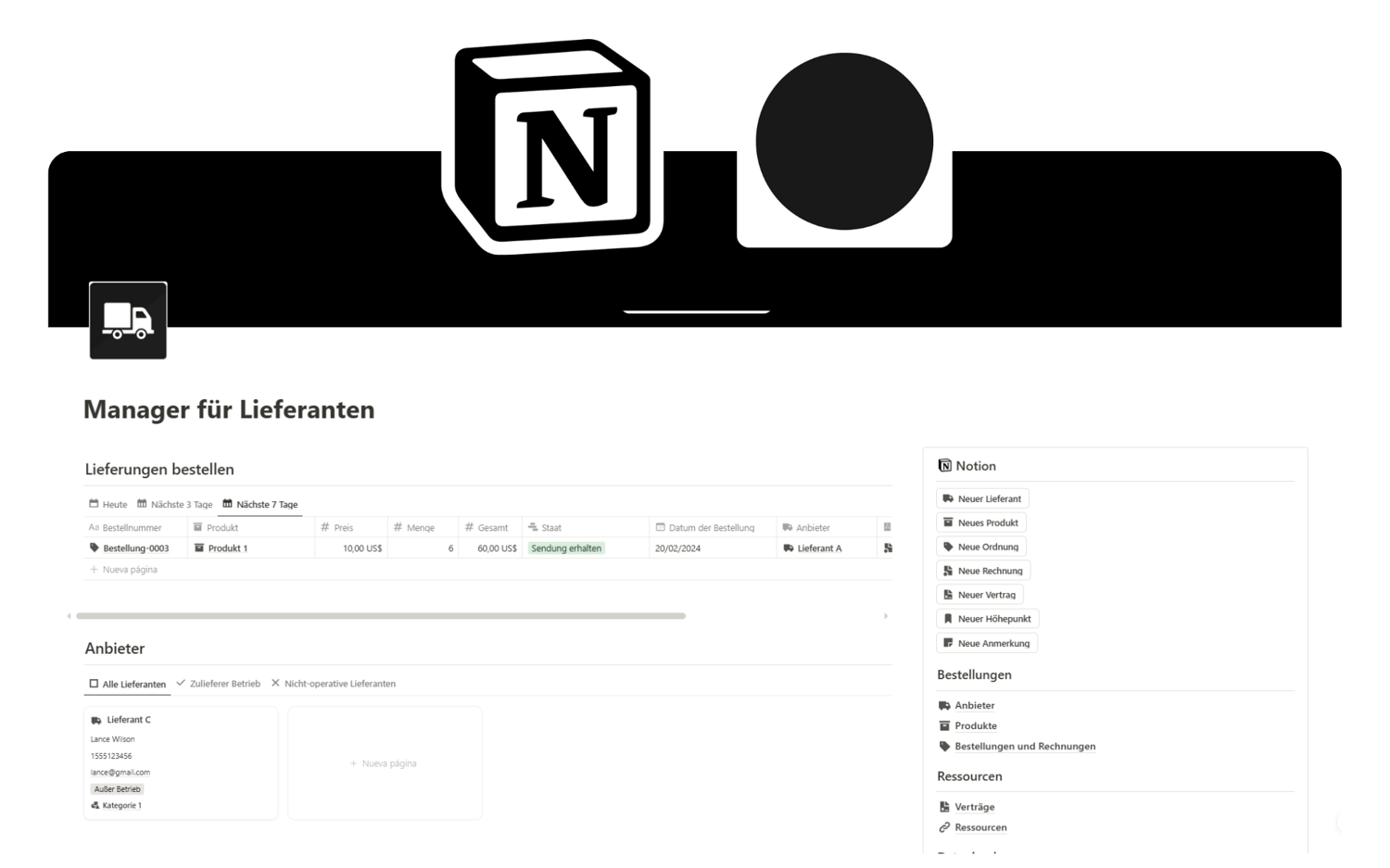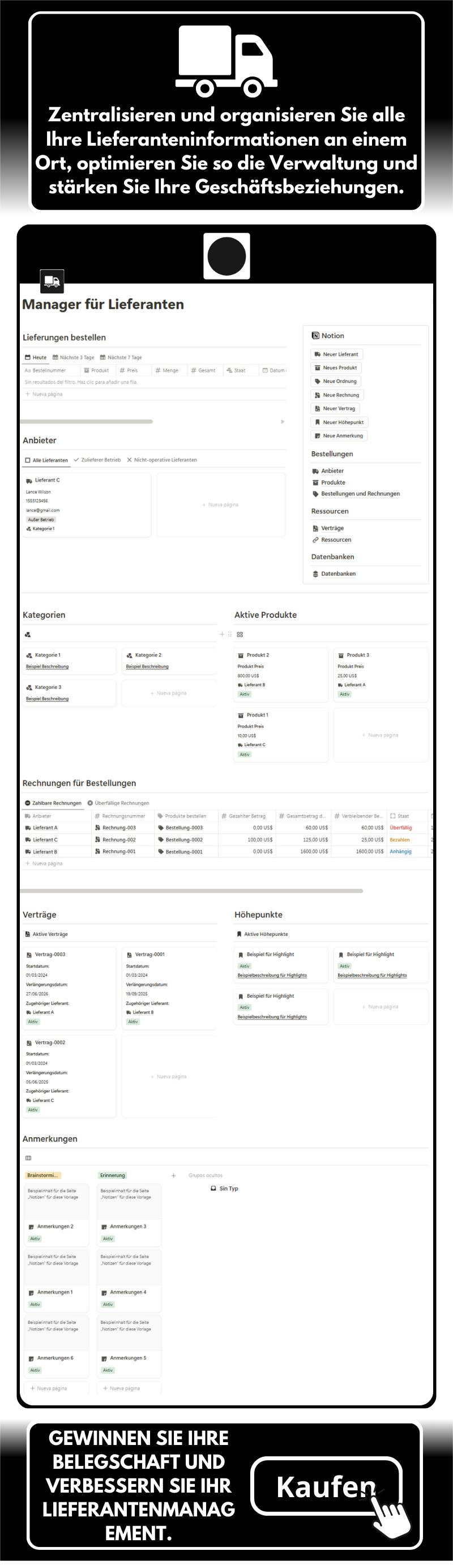 Verbessere das Management deiner Geschäftsbeziehungen mit dieser umfassenden Notion-Vorlage. Der Lieferantenmanager wurde entwickelt, um alle relevanten Informationen über deine Lieferanten, Produkte, Bestellungen und Verträge zu zentralisieren – für fundierte Entscheidungen, effizientere Abläufe und einen klaren, transparenten Workflow.