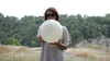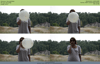 Dina challenges herself to blow to pop a white balloon outdoors.