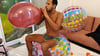 Didier blow to pop 3 balloons and destroy 2 beach balls