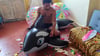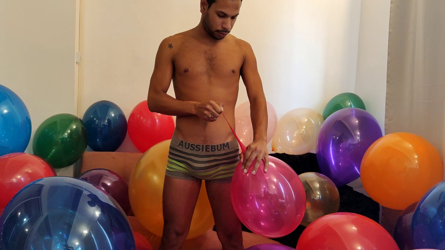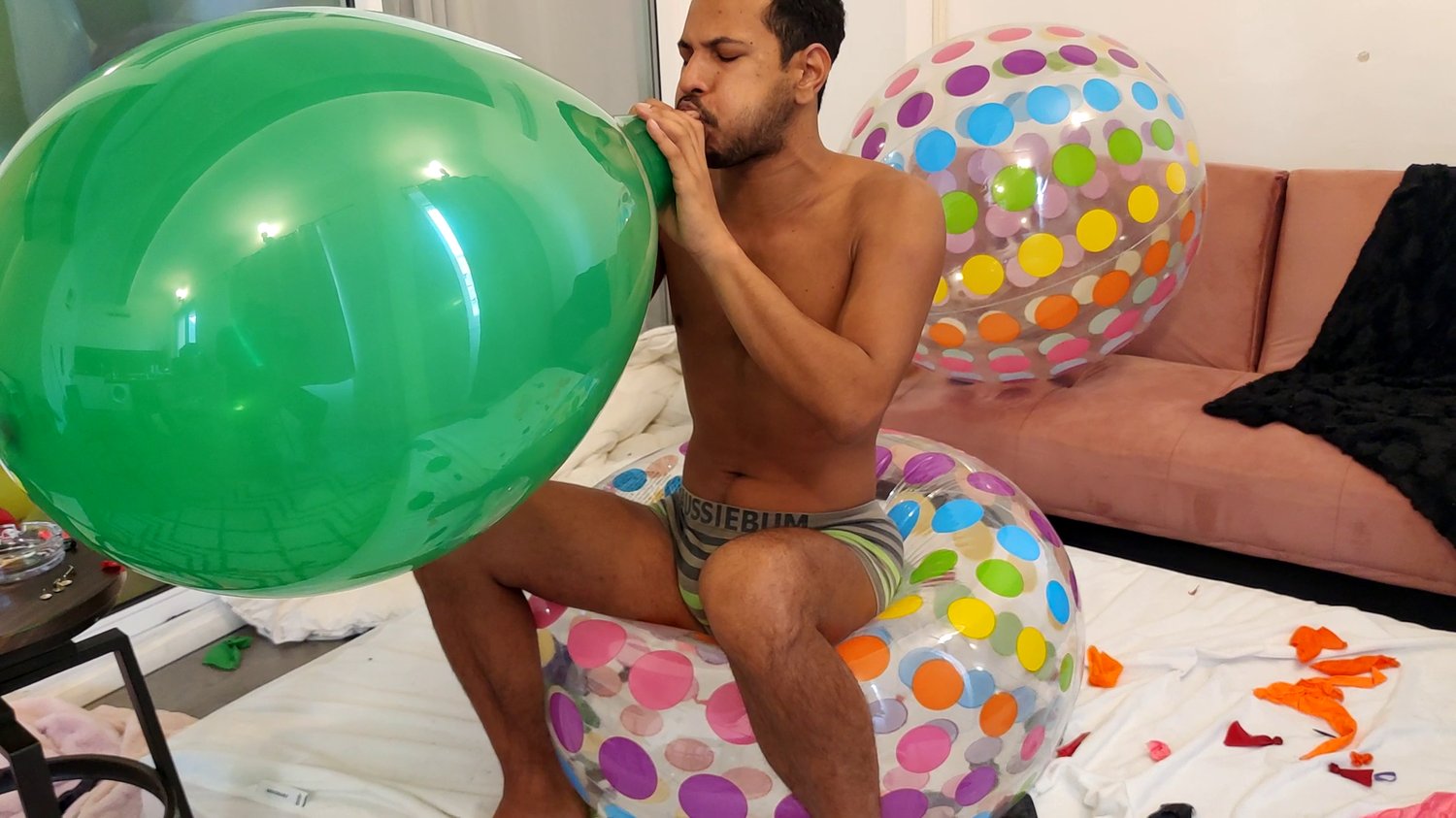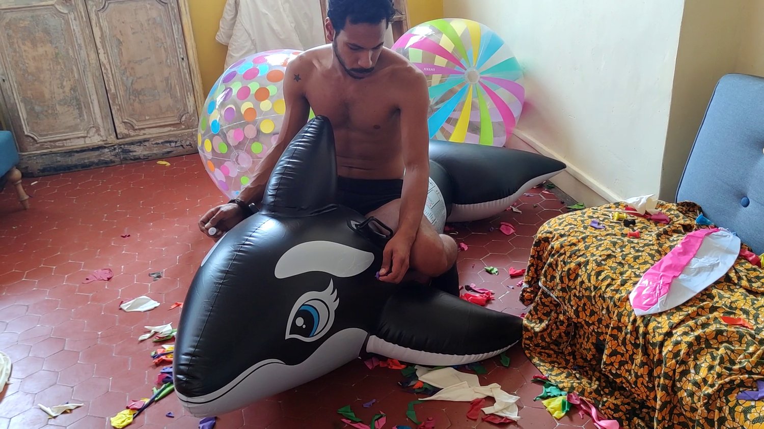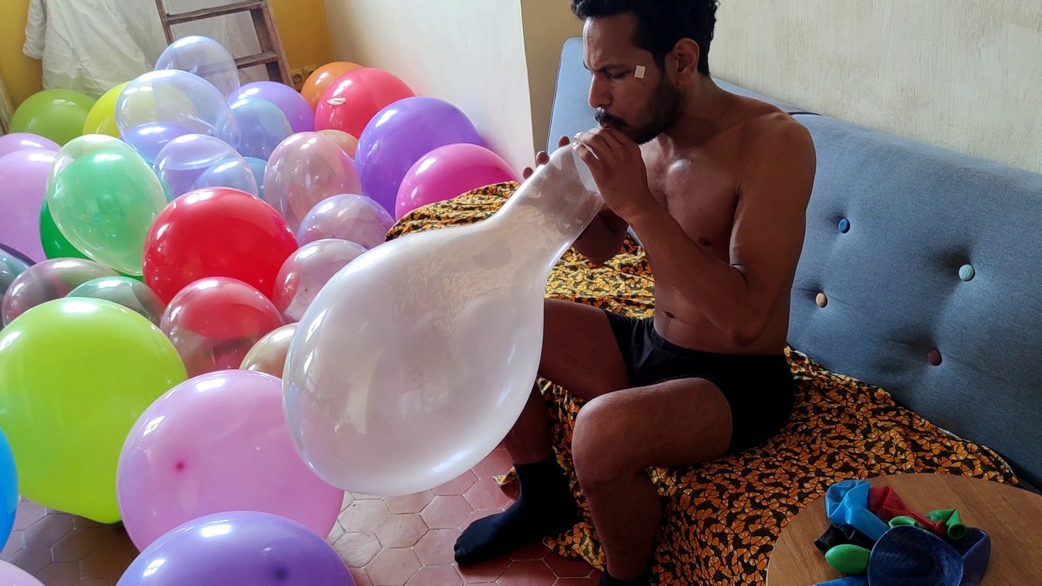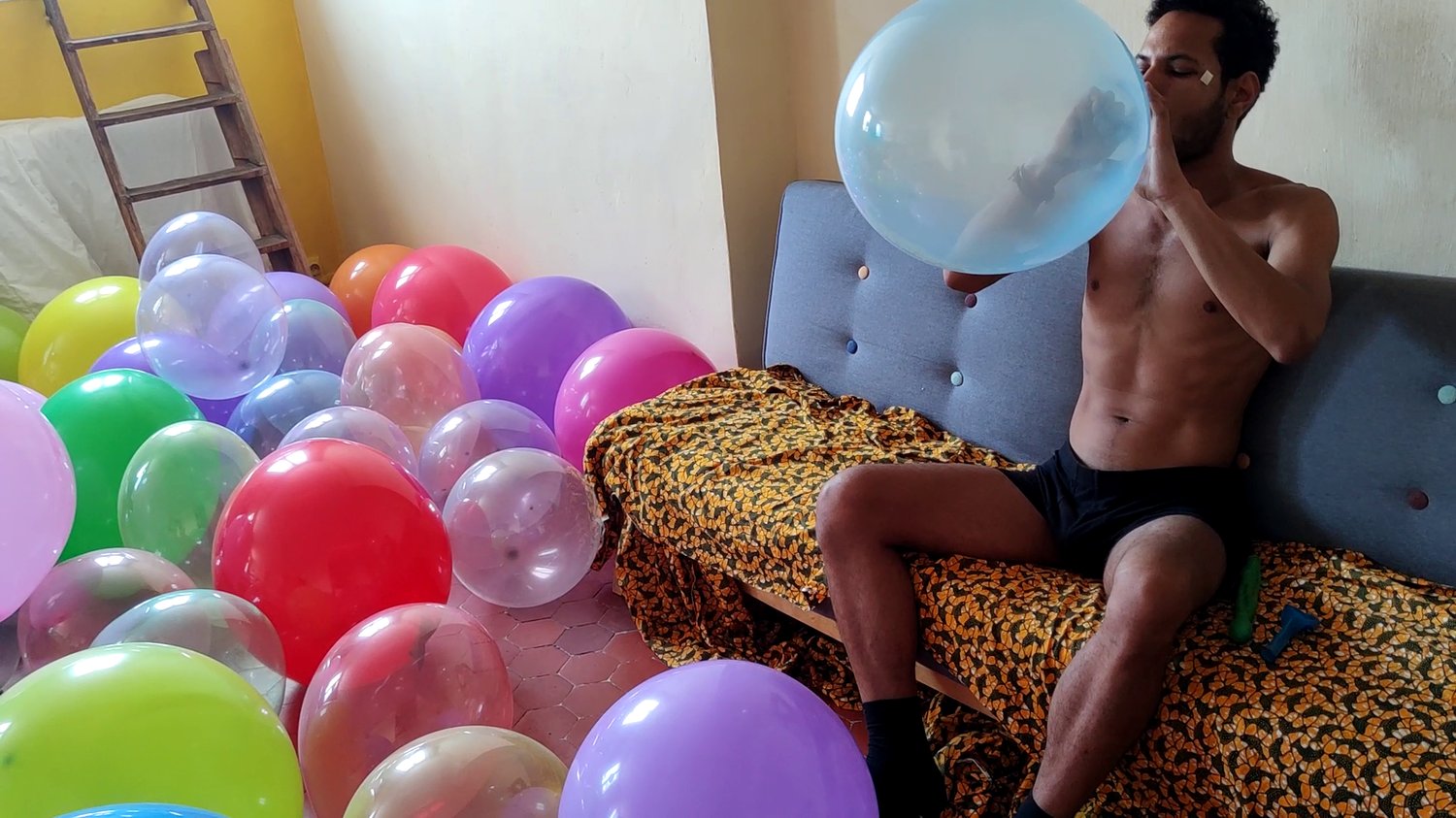 Didier blow balloons and burst the rest of the room