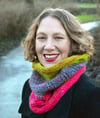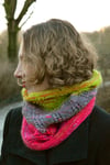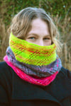 The inspiration for the Flits! Cowl struck when I had been spinning a gorgeous three-colored thick-and-thin singles yarn: the distinctive lace pattern changes direction whenever a color change occurs. Because of this, the Flits! design is not only perfect for yarns with a limited number of large color blocks, but also for stash-busting similar weight yarns.