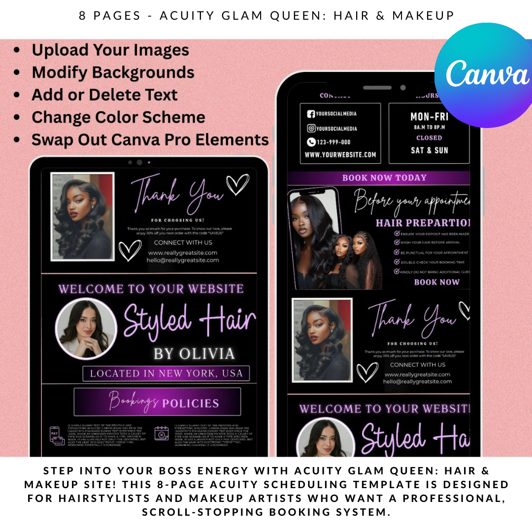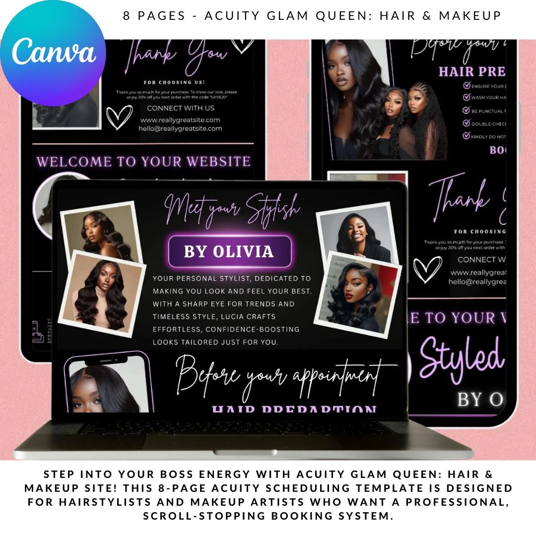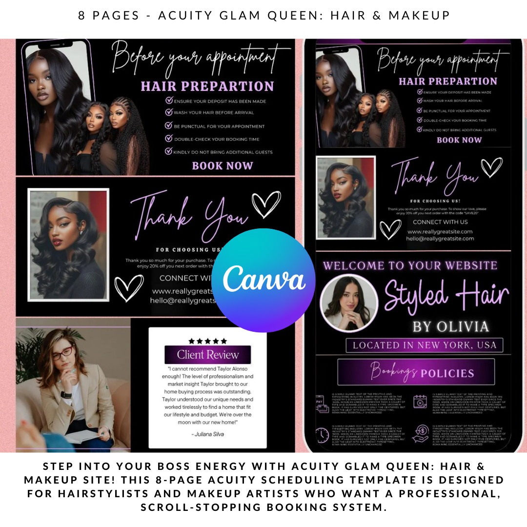 Step into your boss energy with ACUITY GLAM QUEEN: Hair & Makeup Site! This 8-page Acuity Scheduling template is designed for hairstylists and makeup artists who want a professional, scroll-stopping booking system. Fully customizable in Canva, it lets you showcase your services, pricing, policies, and more all in one sleek layout.