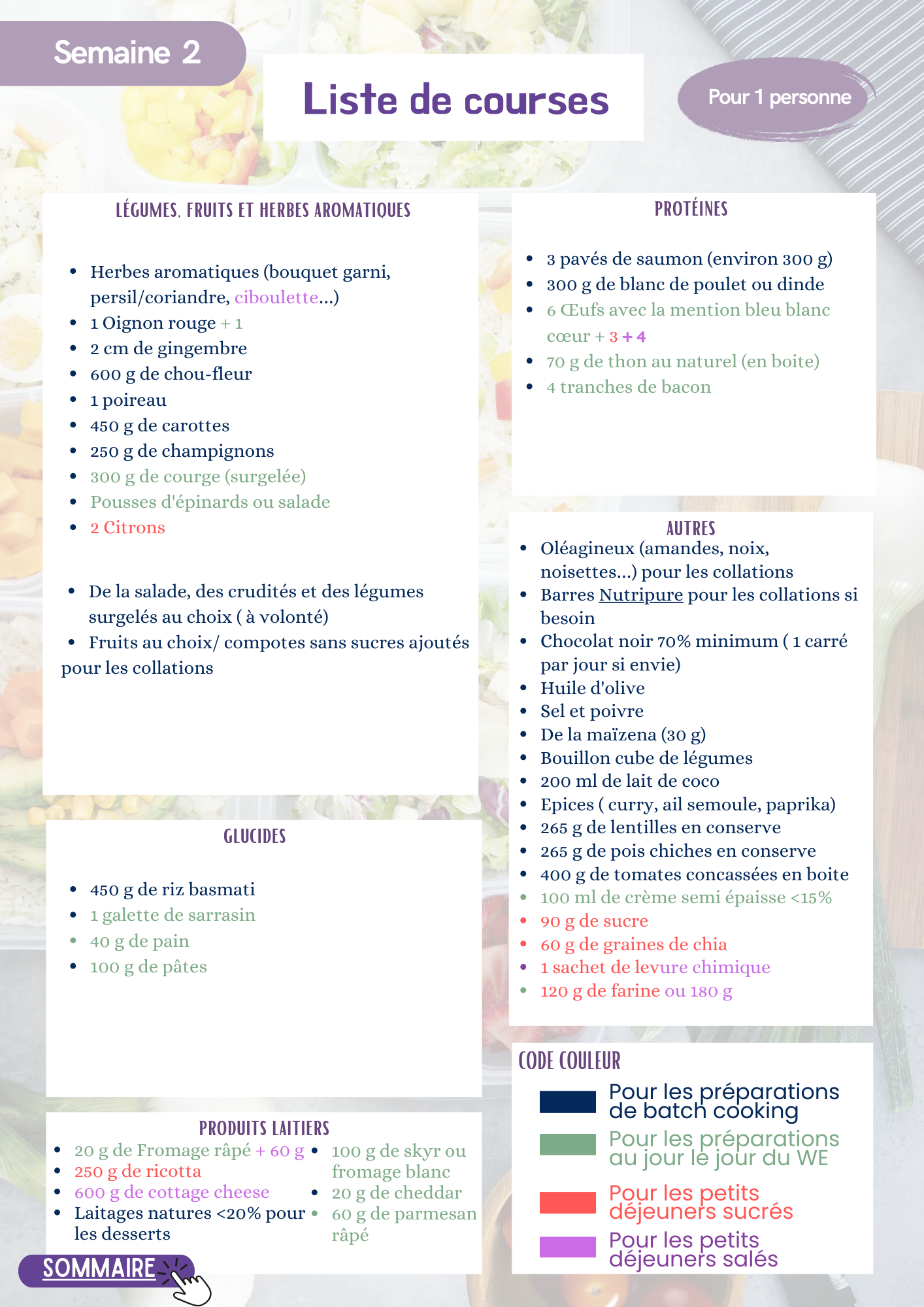 En seulement 1h30 de cuisine, tu prépares tes repas de la semaine, petits-déjeuners compris.