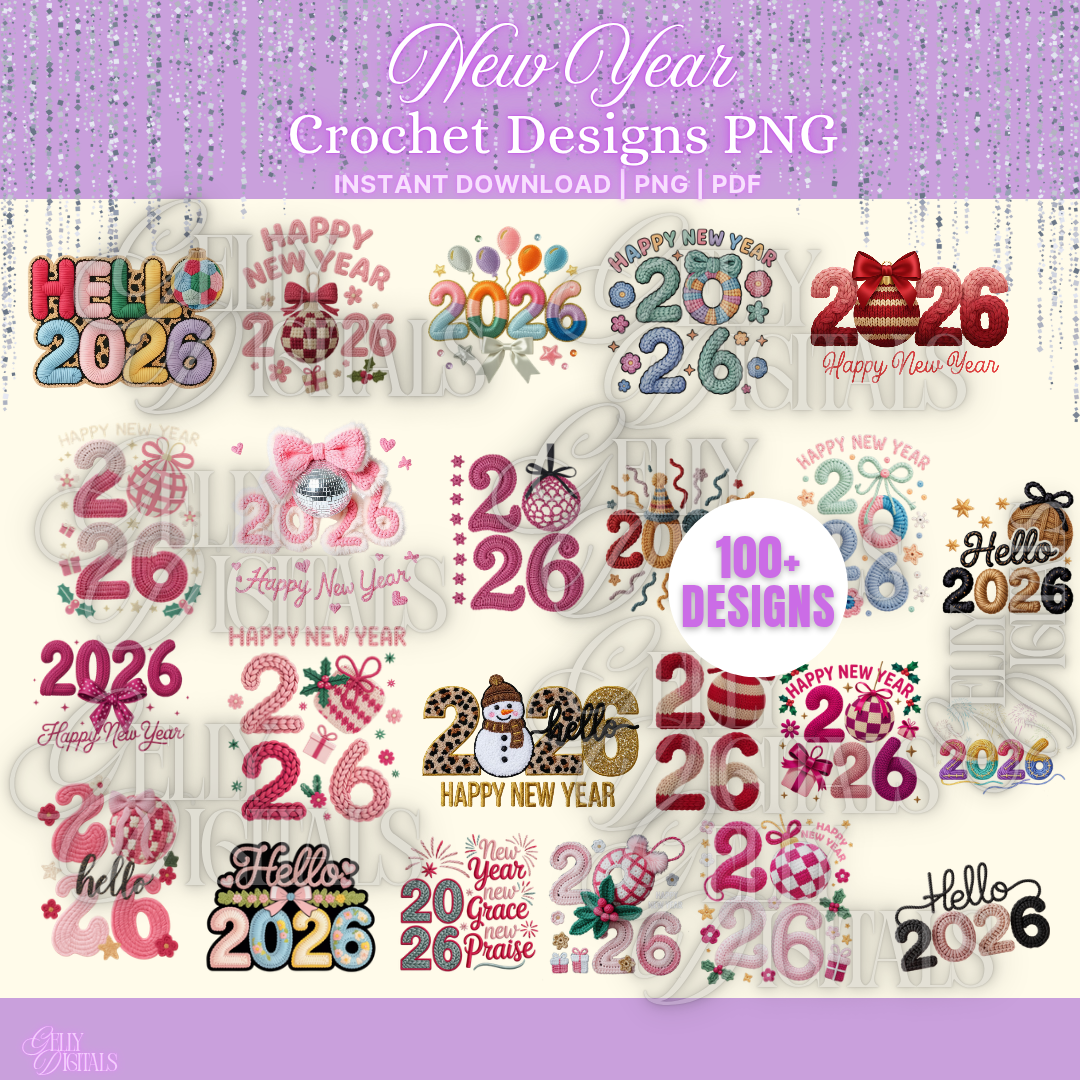 100+ Exclusive PNG Designs: High-resolution (300 DPI) images featuring "Happy 2026" and "Hello 2026" in various colors and crochet-inspired textures.