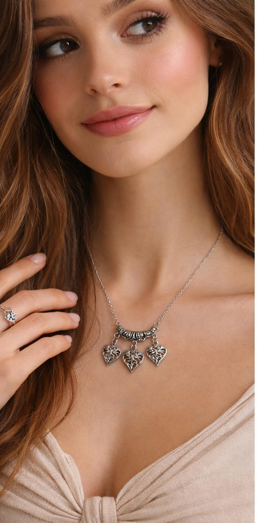 Featuring three delicately detailed heart pendants with elegant scrollwork, this necklace brings a romantic and vintage-inspired charm to any outfit.