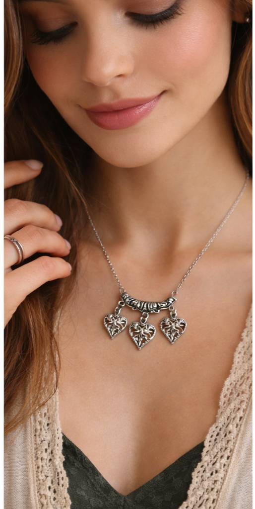 Vintage-Inspired Silver Heart Necklace | Romantic Boho Jewelry | Three Heart Pendant Necklace